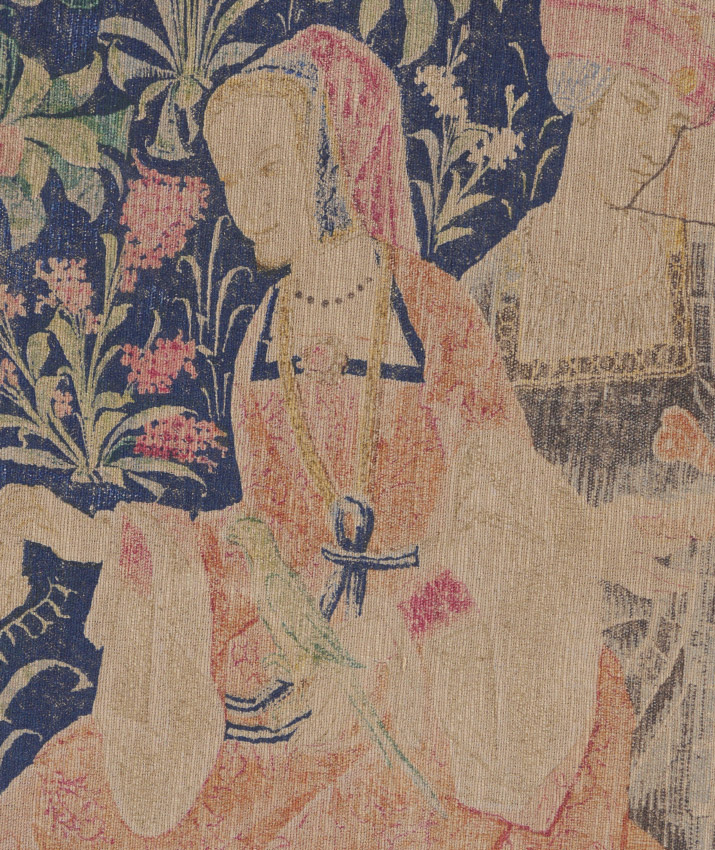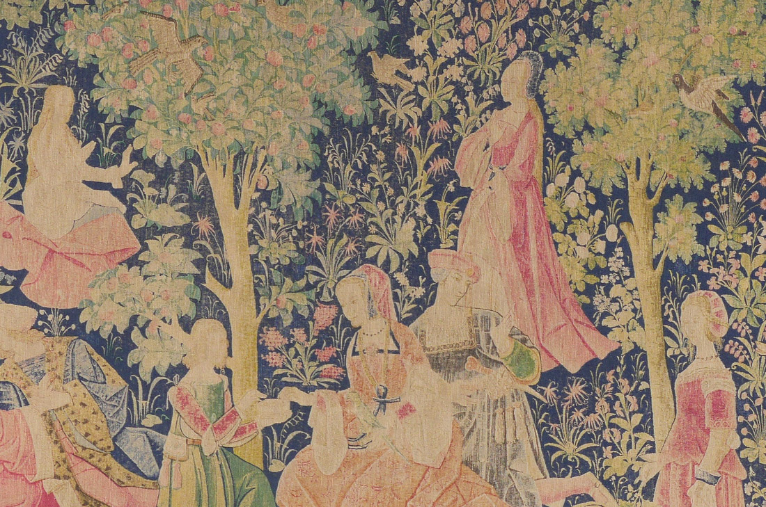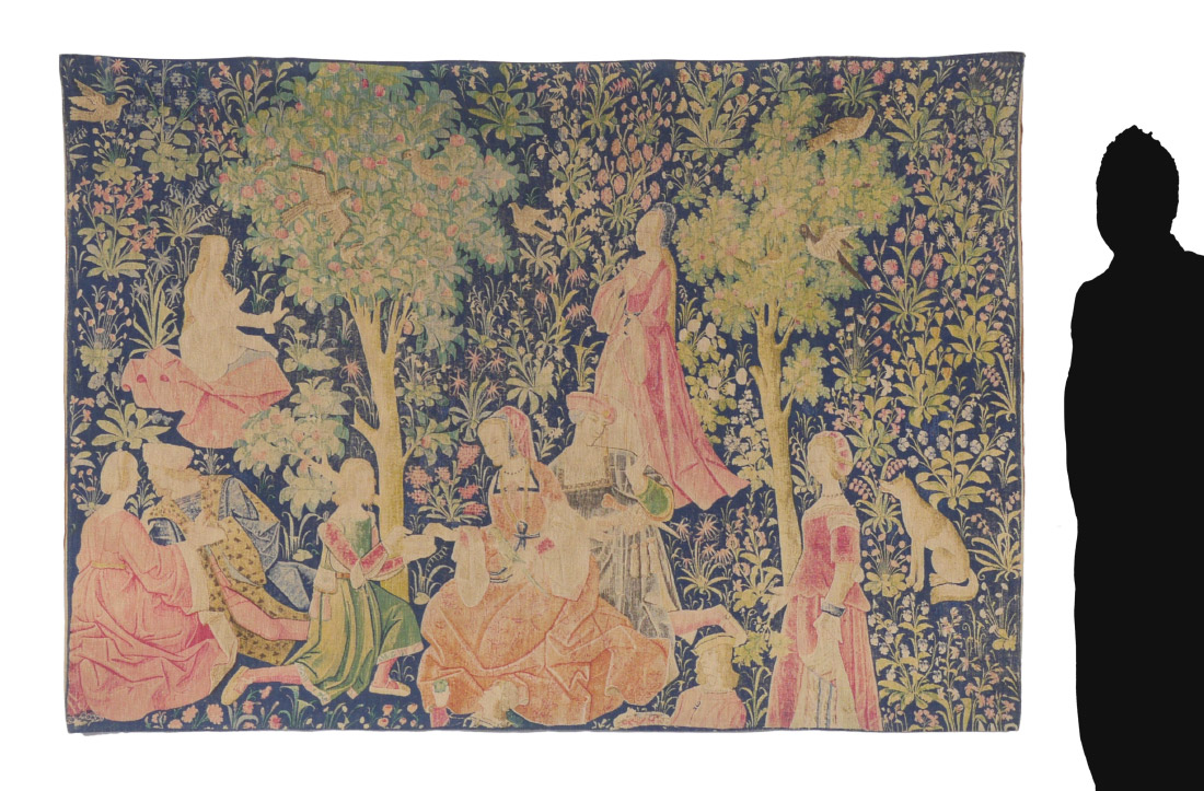 TAPESTRY D'ART DE RAMBOVILLET: 20th C reproduction silkscreen tapestry depicting Les Fete Galante romantic scene. Measures approx. 4'7'' x 6'2''. Label is intact.