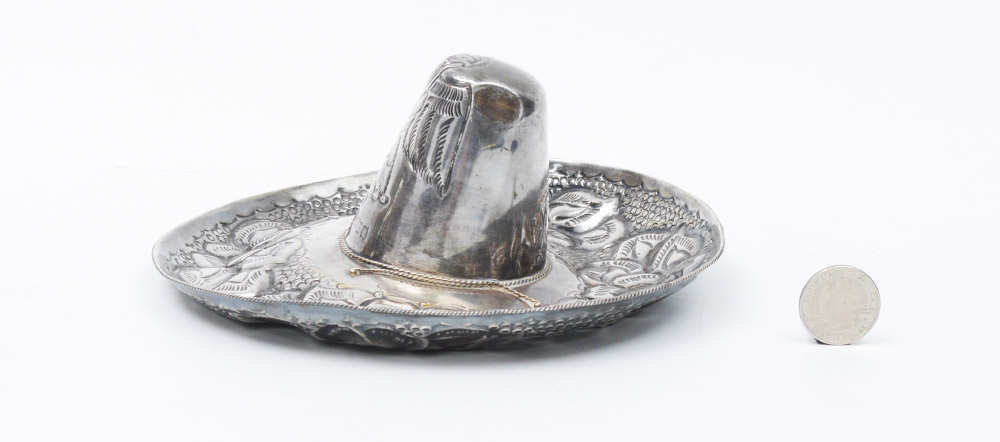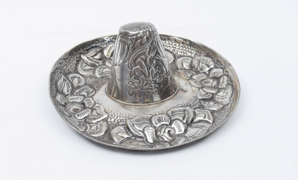 EMBOSSED MEXICAN STERLING SOMBRERO: Embossed floral motifs, and ''Viva Mexico'' on hat, marked on base with eagle bell ''1'', Sterling, Hecho en Mexico 925. 3 1/4'' h. x 7'' dia.. Approx. 4.7 troy oz.