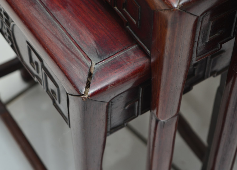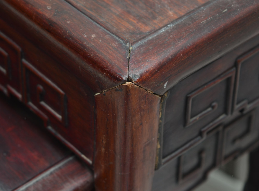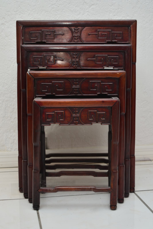 CHINESE CARVED ROSEWOOD NEST OF 4 TABLES: 4 graduating nest of stacking tables, rectangular tops, carved and shaped aprons, slightly shaped legs and stretchers. Tallest measures 28 1/4'' h. x 19'' x 13 3/4'', smallest 16 1/2'' x 12 1/4'' x 8 1/2''.