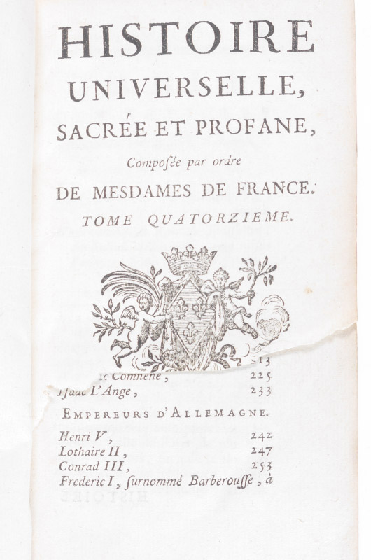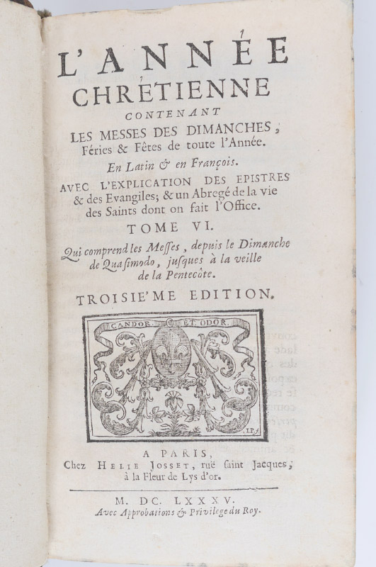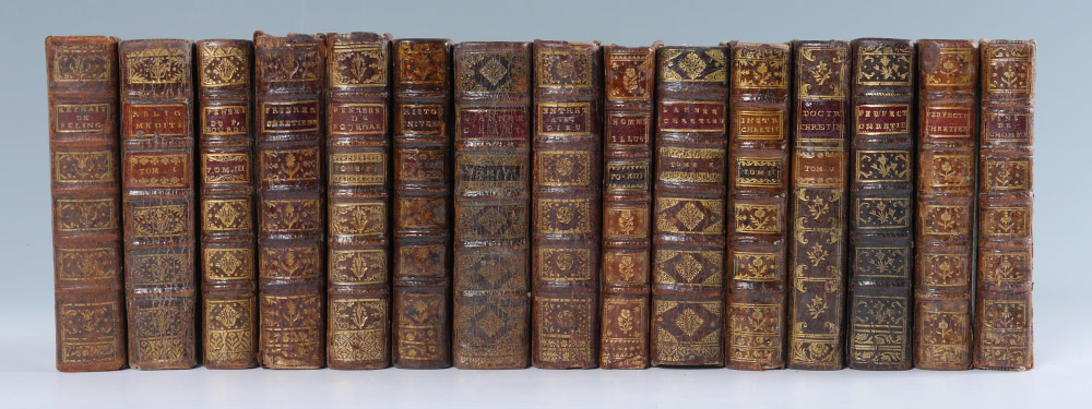 15 VOLUME ANTIQUARIAN BOOKS: 15 assorted volumes, leather bound, embossed spines with raised bands, titles to include 1) ''L'Annee Chretienne'', 1697, Paris. 2) ''Instruction et Instruction Chretienne'', volume 2, Naples, 1779. 3) ''Exposition de la Doctrine Chretienne'', volume 5, 1744, Utrecht. 4) ''Principes de la Perfection Chretienne'', 1749, Paris. 5) ''Principes de la Perfection Chretienne'', 1753, Paris. 6) ''Historie Universelle Sacree et Profane'', volume 14, no date or town. 7) ''L'anne Chretienne'', volume 6, 1735, Paris. 8) ''Entreetiens D'Une Ame Avec Dieu'', 1740, Avignon. 9) ''Memoires Pour Servier a L'Historie des Hommes Illustres'', volume 12 (spine marked volume 13), 1730, Paris. 10) Des Fins Dernieres de L'Homme'', 1778, Paris. 11) ''Pensees du Pere Bourdaloue'', volume 3, 1735, Paris. 12) ''Retraite Spirituelle Pour Tous Les Etats'', 1751, Paris. 13) ''La Religion Chretienne Meditee'', 1745, Paris. 14) ''Pensees du Pere Bourdaloue'', volume 2, 1736, Bruxelles, 15) ''Prieres Chretiennes en Forme de Meditations'', 1766, Paris.
