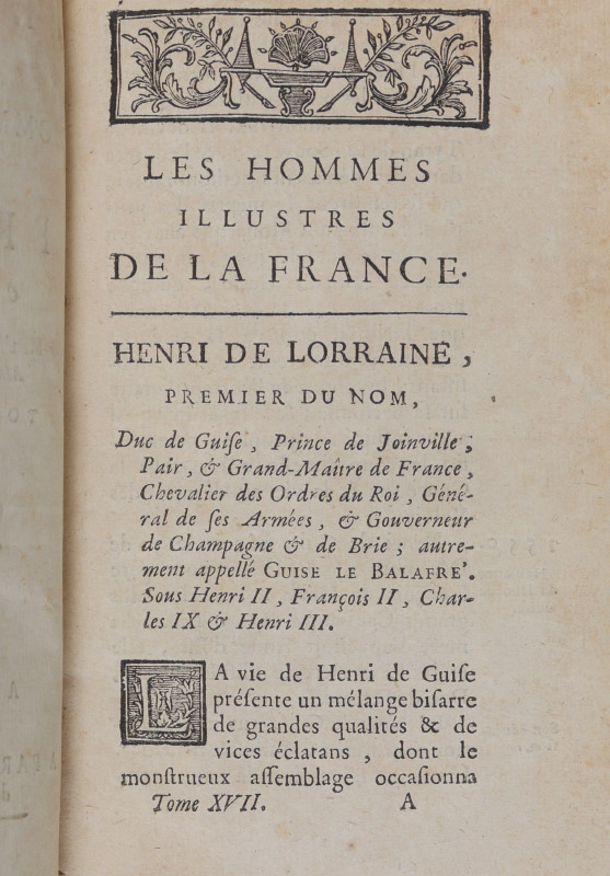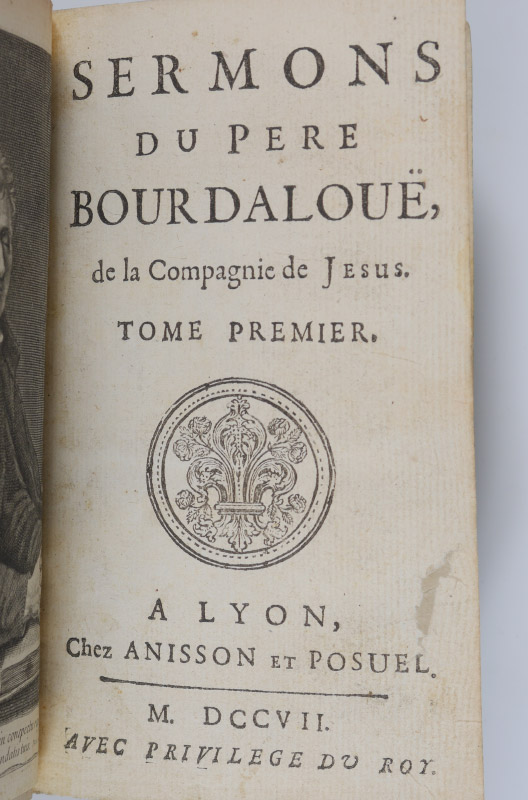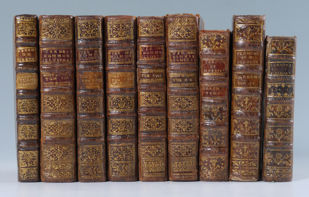 9 VOLUME ANTIQUARIAN BOOKS: 9 assorted volumes, leather bound, embossed spines with raised bands, titles to include 1-5) ''Les Vies des Hommes Illustres de la France), volumes 13, 17, 18, 19, 20, 1746, Amsterdam. 6) ''Sermons Pour Le Carame'', volume 2, 1770, Paris. 7) ''Sermons Pour Plusieurs Dimanches de L'annee'', volume 3, 1728, Avignon. 8) ''Sermons de M. Massillon Eveque de Clermont'', 1742, Paris. 9) ''Sermons du Pere Bourdaloue'', 1707, Lyon.