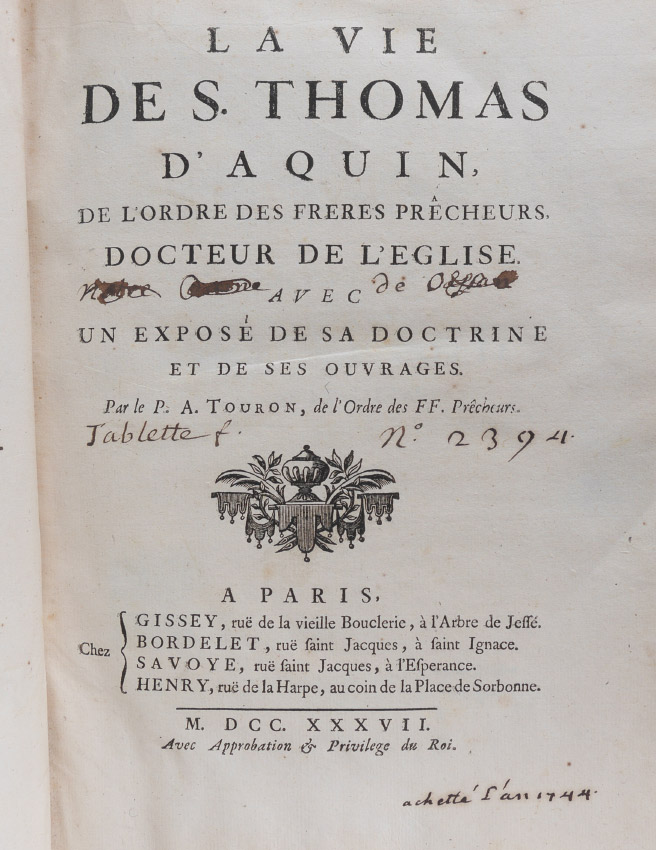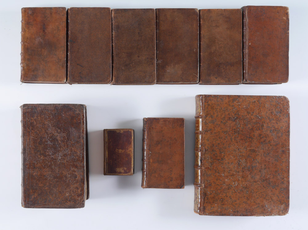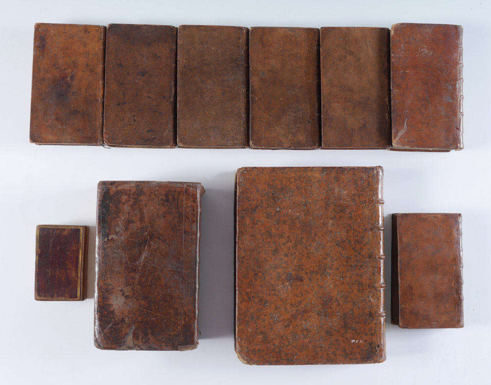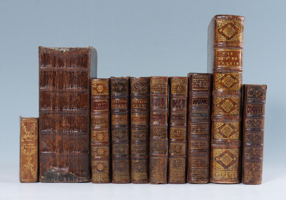 10 VOLUME ANTIQUARIAN BOOKS: 10 assorted volumes, leather bound, embossed spines with raised bands, titles to include 1-2) ''Effusion de Coeur ou Entrtien Spritiuel et Affectif D'Une ame Avec Dieu'' , volumes 2,4, 1716, Paris. 3-5) ''La Vie de Jesus-Christ Tiree Des Quatre Avangiles'', volumes 1-3, 1741, Paris. 6) ''De La Connoissance de Jesus-Christ'', volume 1, 1780, Paris. 7) ''La Piete Envers Jesus-Christ ou Meditations'', 1697, Rouen. 8) ''Le Livre du Sacre Coeure de Jesus et du Saint Coeur de Marie'',1840, Orange. 9) ''La Vie De S. Thomas d'Aquin de L'Orde des Freres Precheurs'', 1737, Paris. 10) ''Die bibel Ober Die Ganze Heilige Schrift'', 1814, Husse.