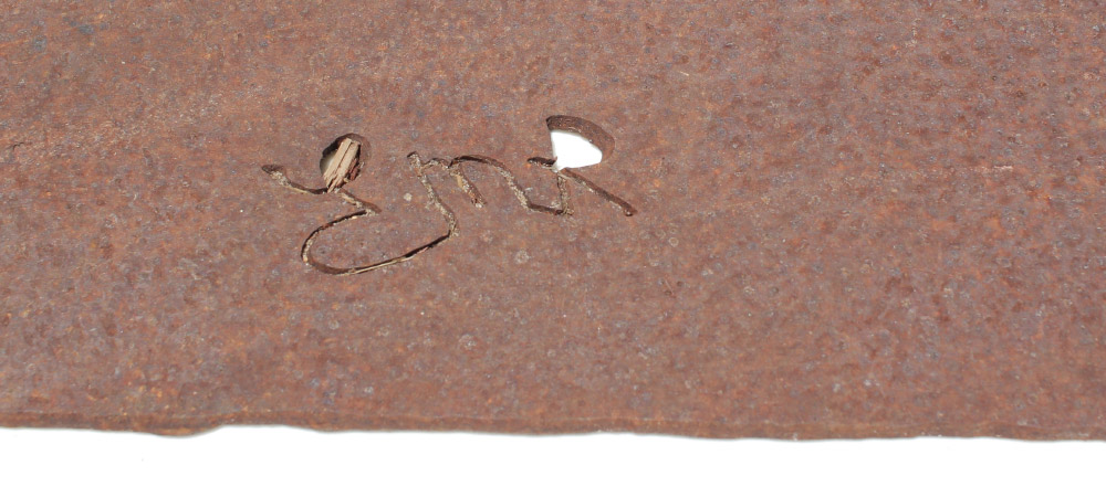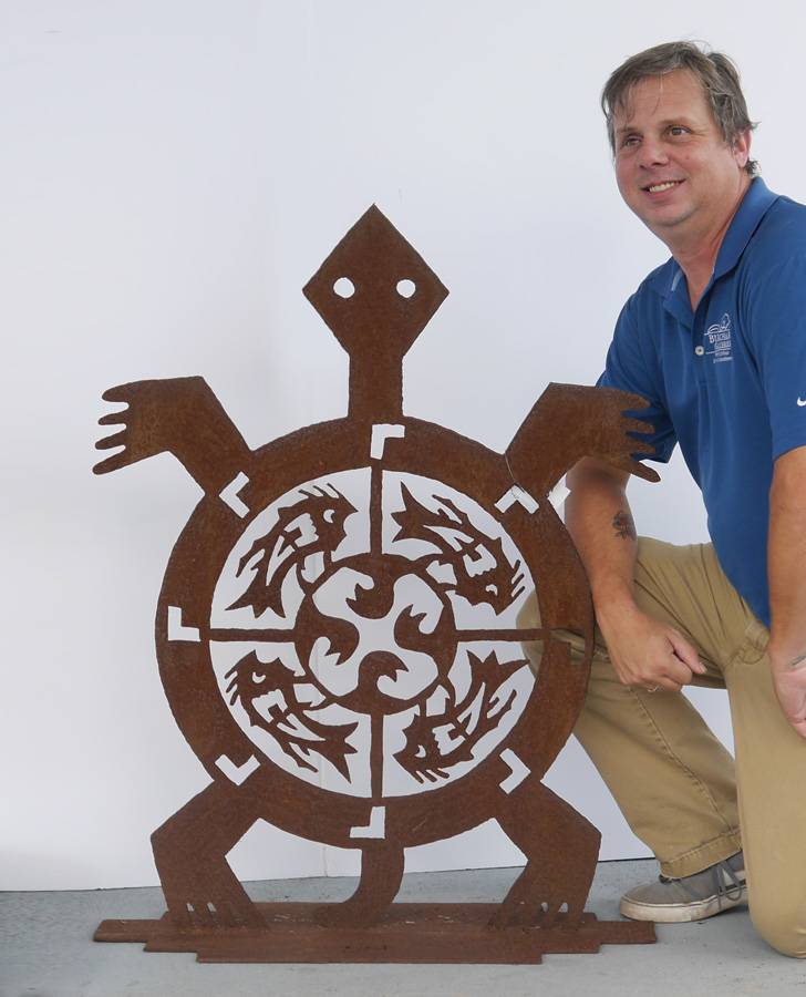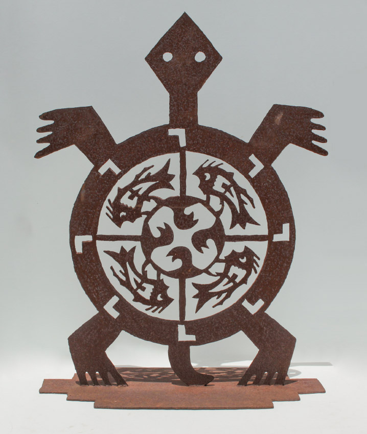 NORTHWEST TRIBAL DESIGN METAL TURTLE SCULPTURE: 39 1/2'' h. x 30'' w., signed EMR on base.