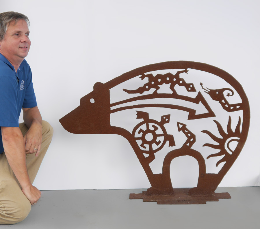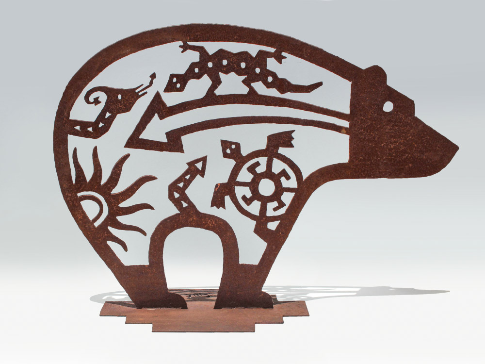 NORTHWEST TRIBAL DESIGN METAL BEAR SCULPTURE: 32'' h. x 42'' w., signed EMR on base.