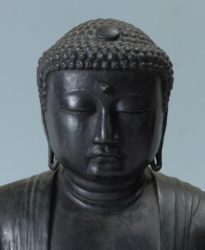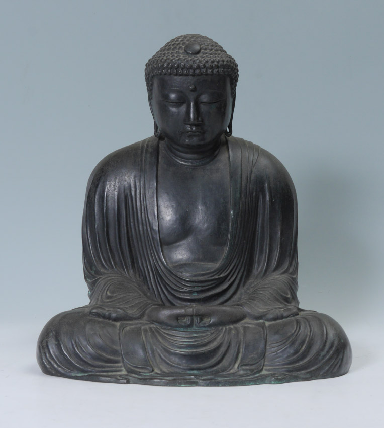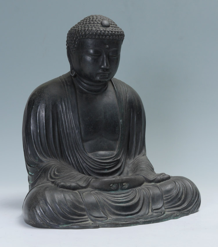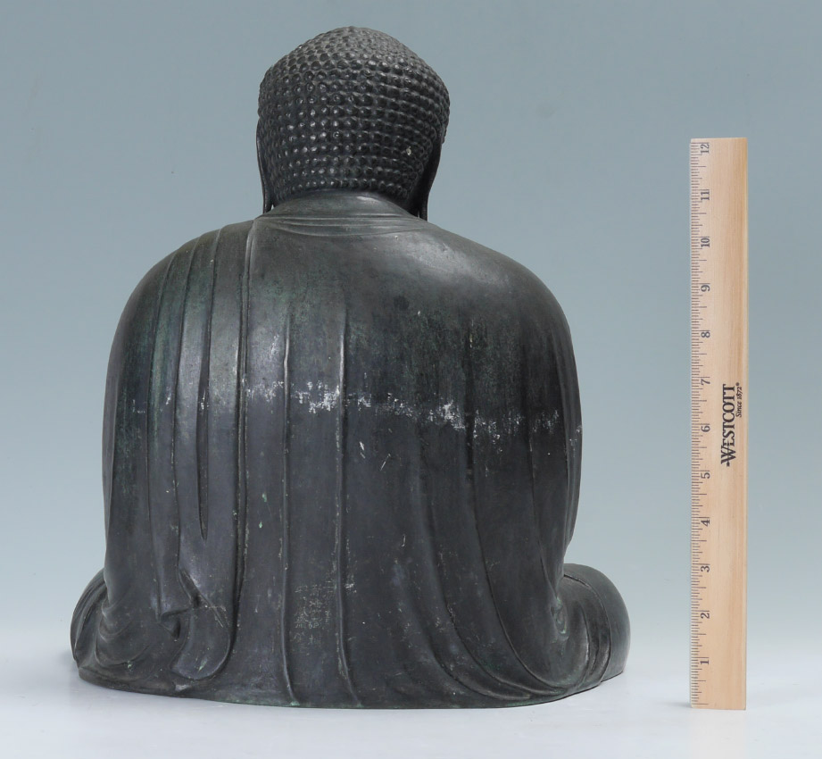 NICELY SCULPTED BUDDHA BRONZE SCULPTURE: Patinated bronze figure of a seated Buddha in the lotus position. Unmarked, 15'' h. x 13 1/2'' x 10 1/2''. Sold with a scholars stone for his lap. Actual age unknown.