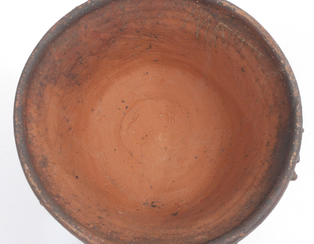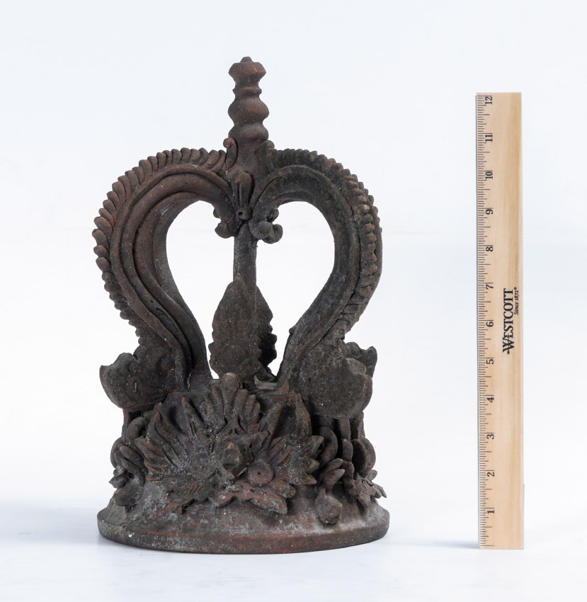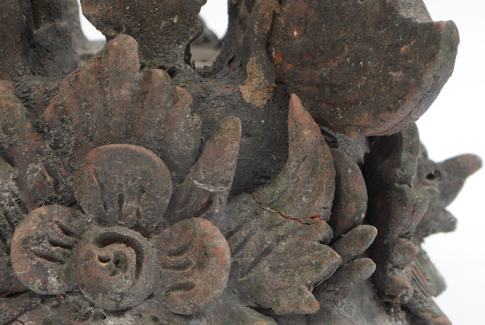 THAI TERRACOTTA ARCHITECTURAL FRAGMENT / LID: Crown form terra cotta fragment or lid to vessel with stylized flowers, and mythological bird busts. Overall measures 13 1/4'' h. x 10 1/2''.