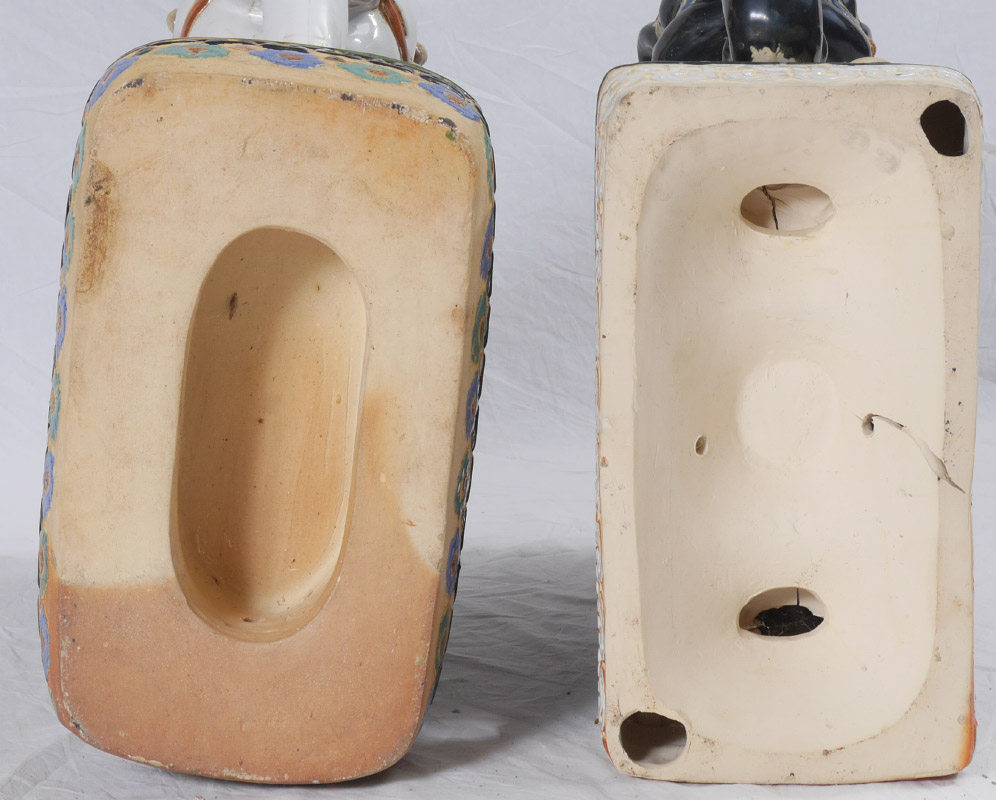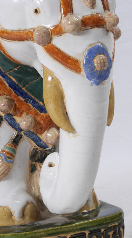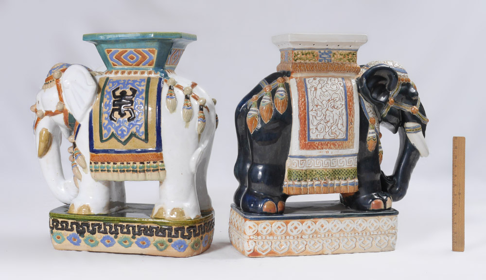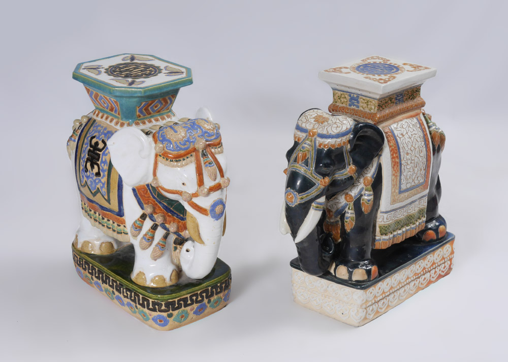 2 ELEPHANT GARDEN SEATS: 2 full figure elephant garden seats or plant stand similar in size and shape, each with different polychrome glazes. White body measures 23'' h. x 20 1/2'' x 11'', blue body 22 3/4'' h. x 21 1/2'' x 9''.