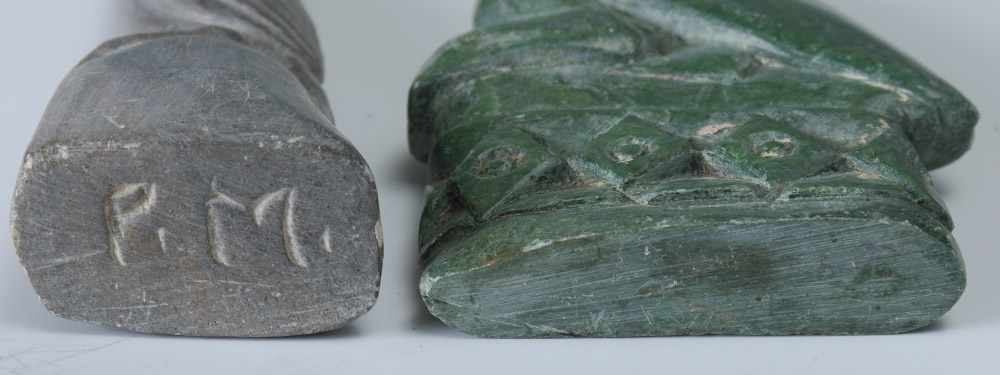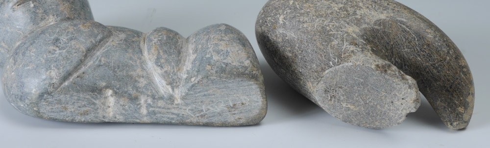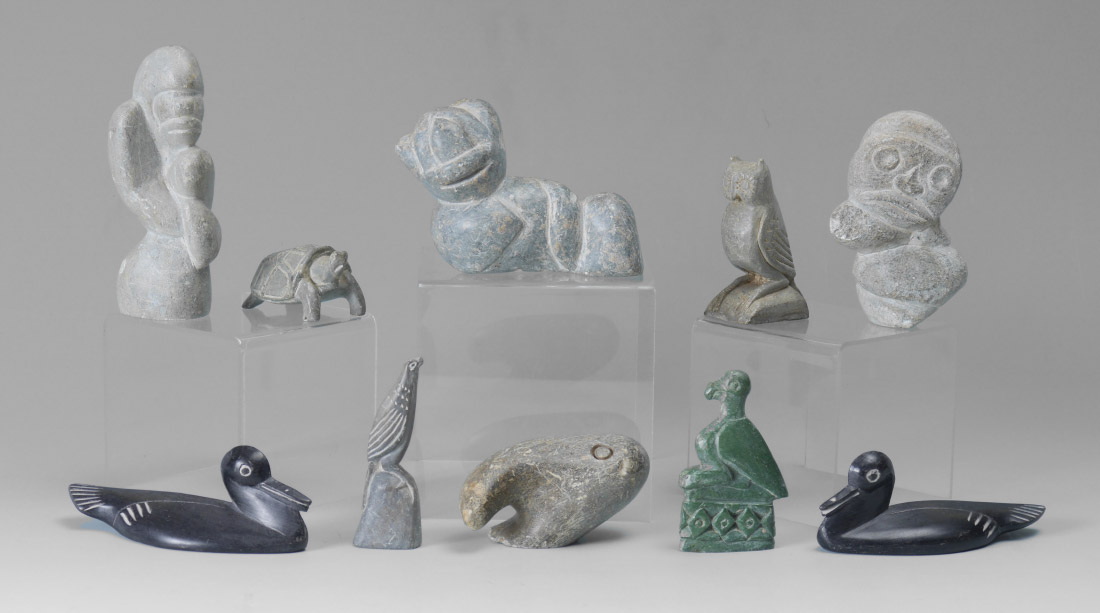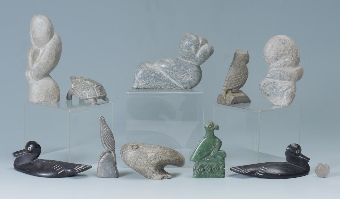 COLLECTION OF CARVED STONE FIGURES: An assorted collection 10 carving, various stones, to include ducks, owl, tortoise, birds and stylized figures. Tallest figure 5 3/4'' h. x 2 3/4''.