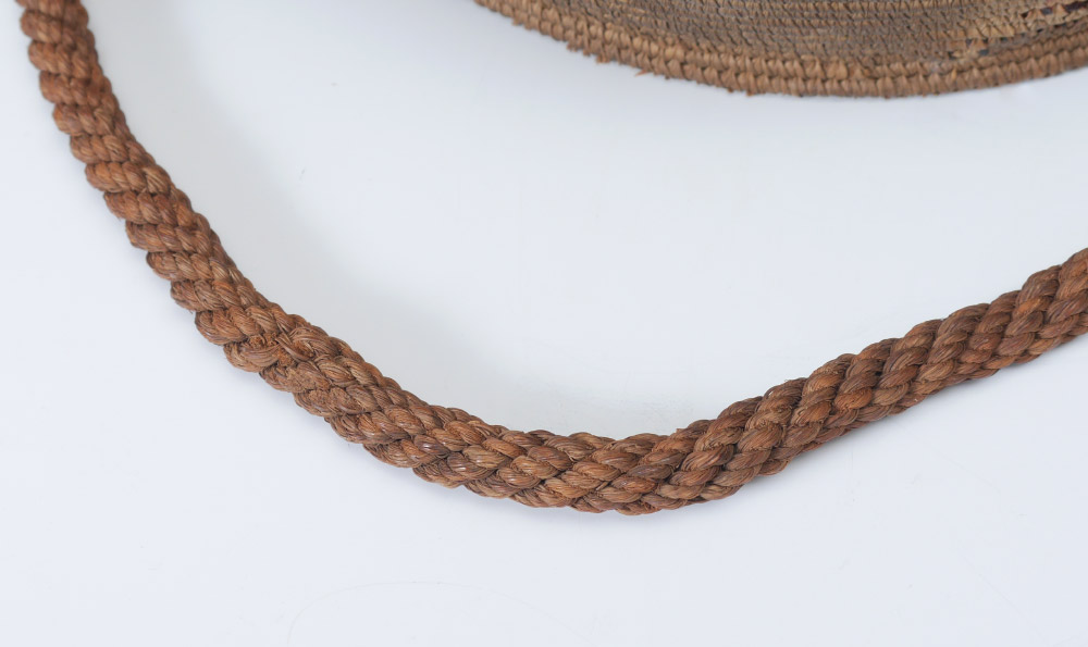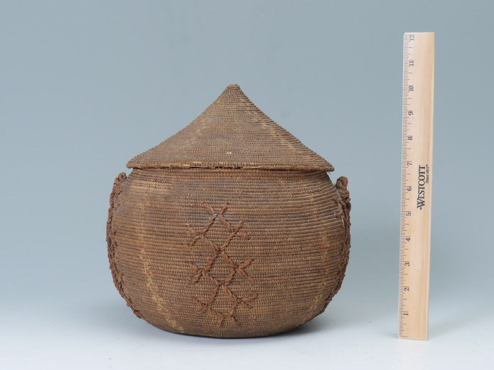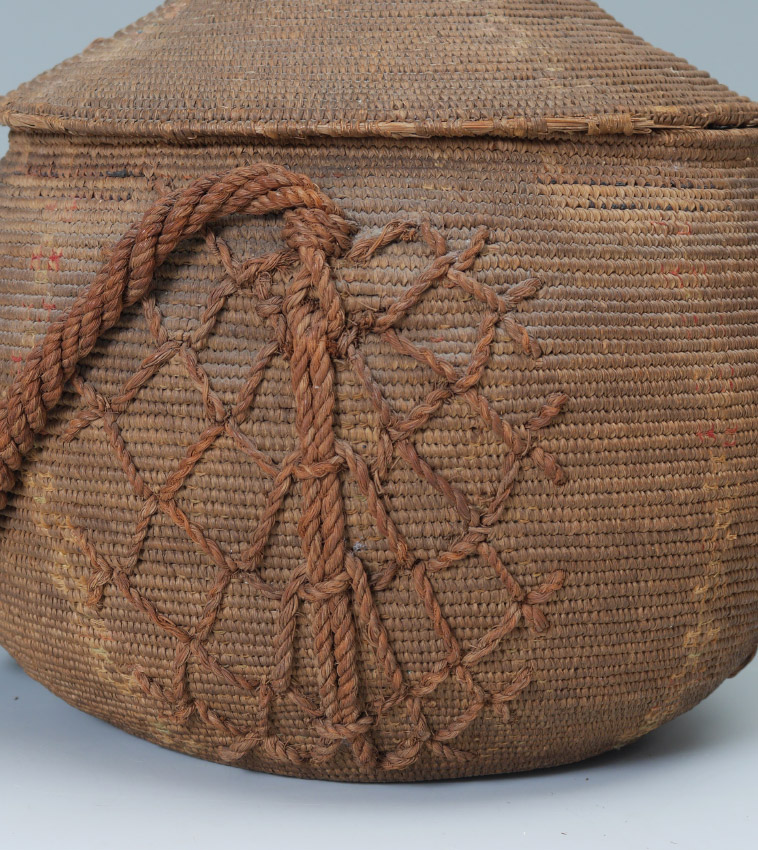 AFRICAN WOVEN COVERED BASKET: With woven decoration and handle. Overall measures 10 1/2'' h. x 10''.