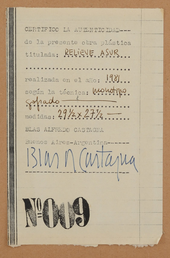 CASTAGNA, Blas, (Argentinian, 1935- ): ''Relieve Asur'', Monotype, sight size 20'' x 16'', signed lower right, labeled verso, framed, 22 1/2'' x 18 1/2''.