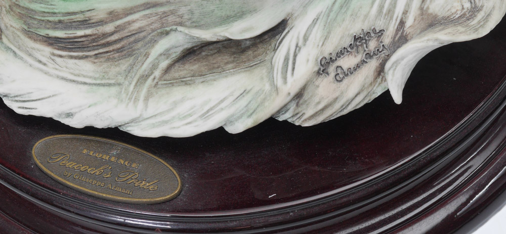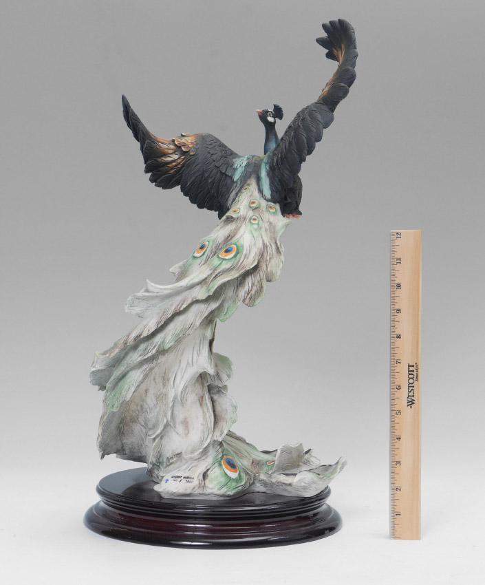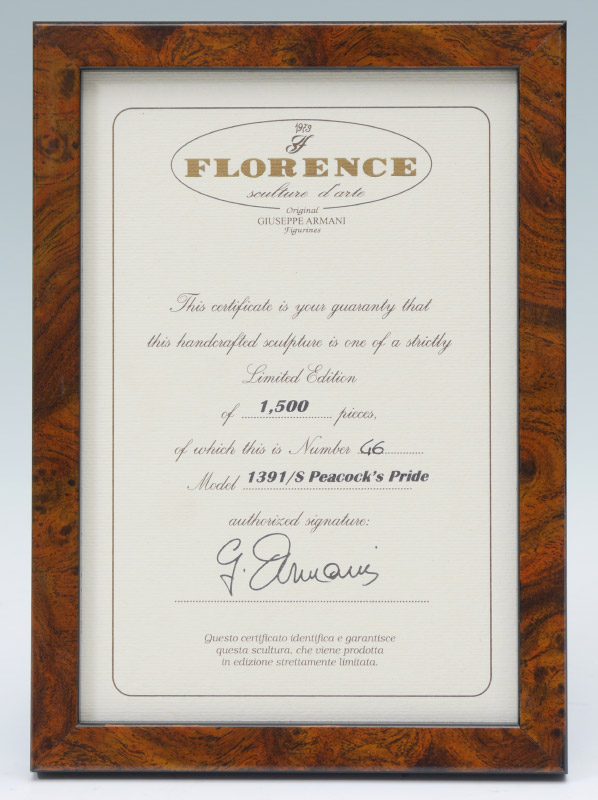 GIUSEPPE ARMANI FLORENCE SCULTURE d'ARTE, ''PEACOCK'S PRIDE'' 1391/S: Limited edition #96 of 1500. Sold with the framed certificate, box is not available. Measures approx. 21'' tall x 11'' x 12''.