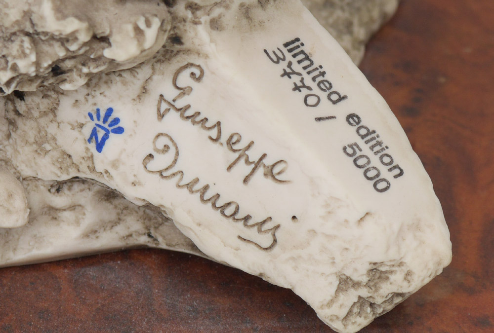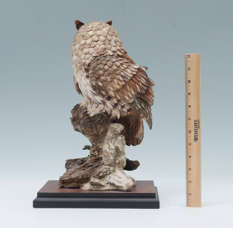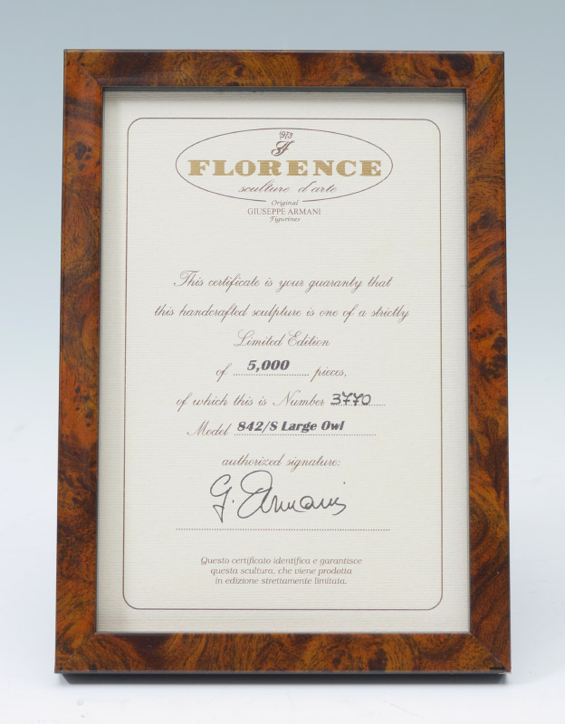 GIUSEPPE ARMANI FLORENCE SCULTURE d'ARTE ''LARGE OWL'', 842/S: Limited Edition 3770/5000. Sold with the framed certificate. The box is not available. Approx. 16'' tall x 9'' x 7''.
