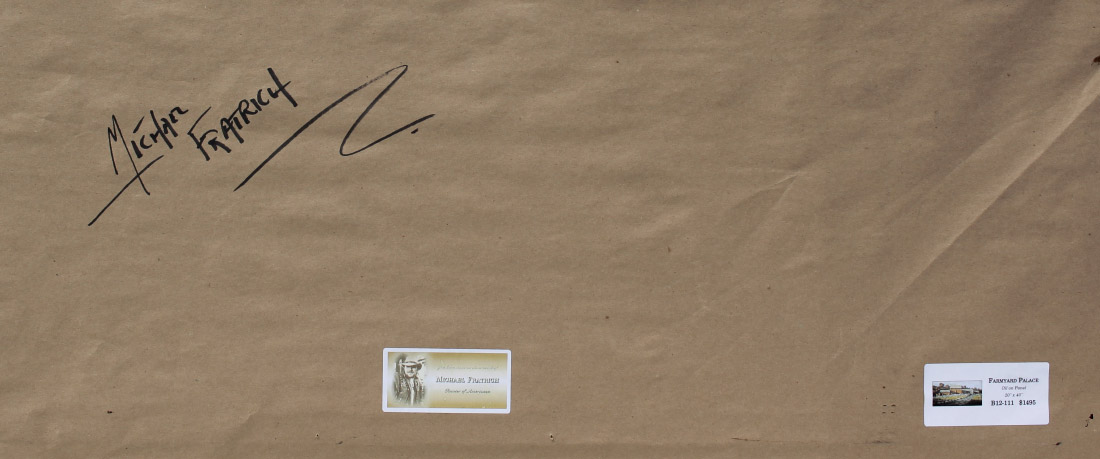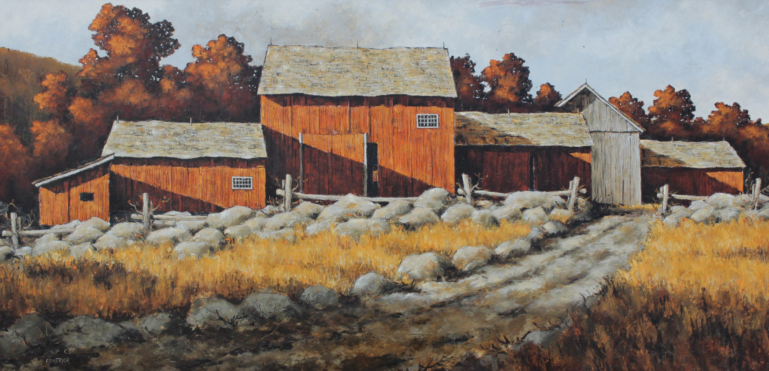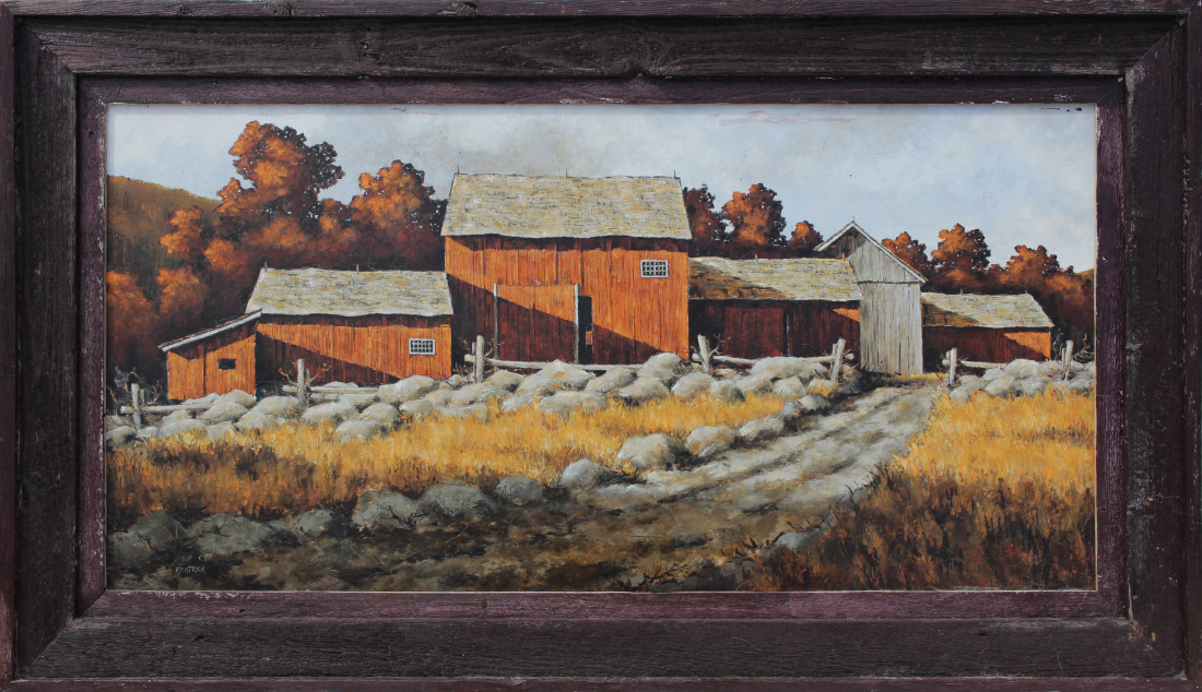 FRATRICH, Michael, (American, 1968- ): Red Barns, Oil/Board, sight size 20'' x 40'', signed lower left, custom barnwood frame, 27'' x 47'', artist label affixed verso.