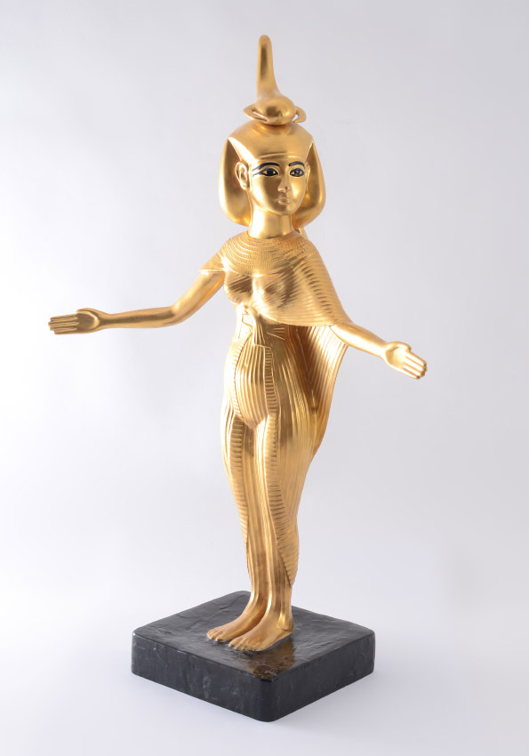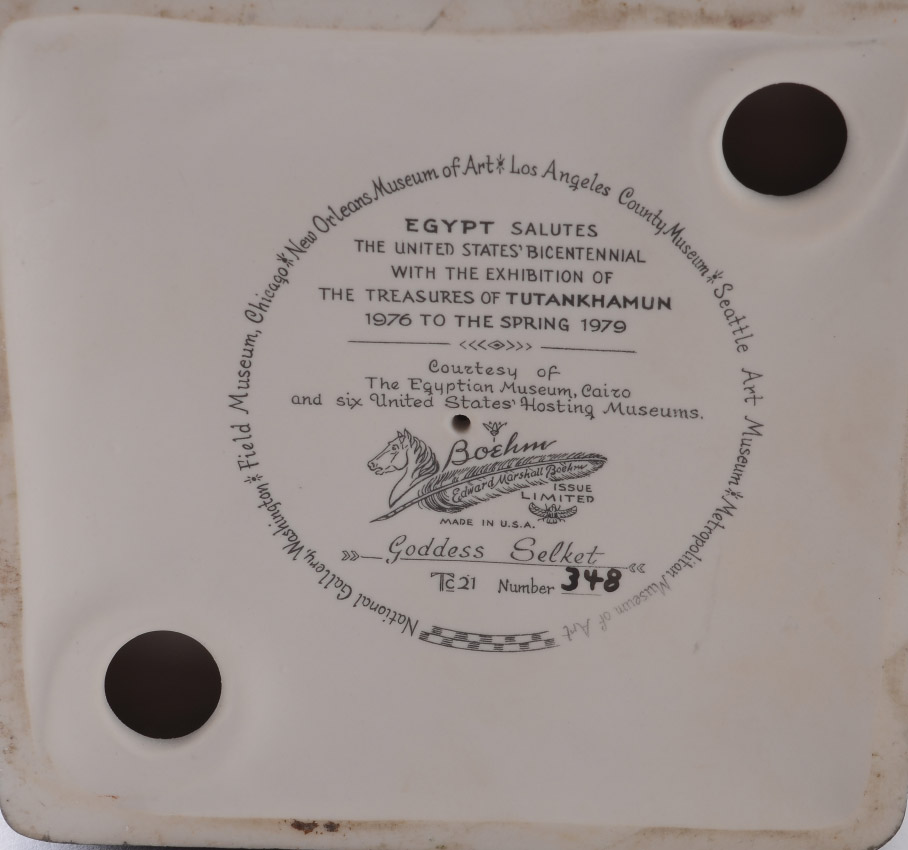 BOEHM PORCELAIN FIGURE OF THE EGYPTIAN GODDESS SELKET: Gilt porcelain, made in USA. Measures approx. 17'' tall, her hands spread to 11 1/2''.