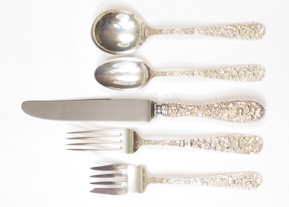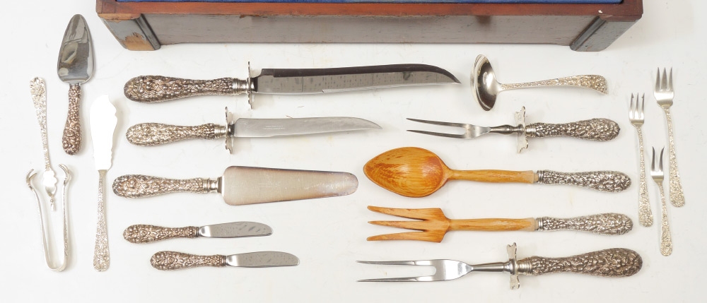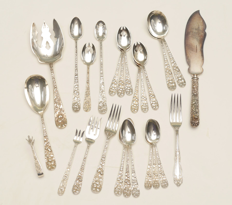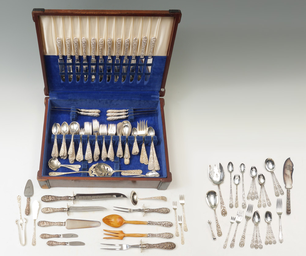 LARGE STIEFF ROSE STERLING FLATWARE SET: Approx. 165 pieces in the Stieff Rose pattern to include 15 teaspoons (5 7/8''), 15 five o'clock teaspoons (5 5/8''), 6 soup spoons (6''), 6 soup spoon (6 1/2''), gumbo spoon (7''), 9 iced tea spoons (7 1/2''), 16 demitasse spoons (4 1/4'') 13 forks (6 7/8''), 2 forks (7 3/8''), 21 salad forks (6''), 17 hollow knives (8 7/8''), master butter (7 1/8''), 14 solid butter knives (5 7/8''), hollow butter (6''), 3 oval serving spoons (8''), 3 sugar spoons (6''), 2 cold meat forks (7 1/2''), pierced pea serving spoon (8''), 2 bon bon spoons (5 1/4''), ice cream fork (5 3/4''), butter pick (5 3/4''), gravy ladle (6 1/4''), cocktail fork (6), oyster fork (5 3/4''), lemon fork (4 1/2''), sharp edge spoon (6 1/2''), sugar tongs (4 1/4''), bacon fork (8 1/4''), hollow salad set (fork 11'', spoon 11''), large carving set (knife 14'', fork 11 1/2''), smaller carving set (knife 10 1/2'', fork 9 1/8''), pie server (10''), cheese server (6 1/2''). Sold with a selection of similar pattern sterling flatware from other makers, approx. 25 pieces. Nearly all pieces monogrammed. Approx. 203.5 troy oz. total.