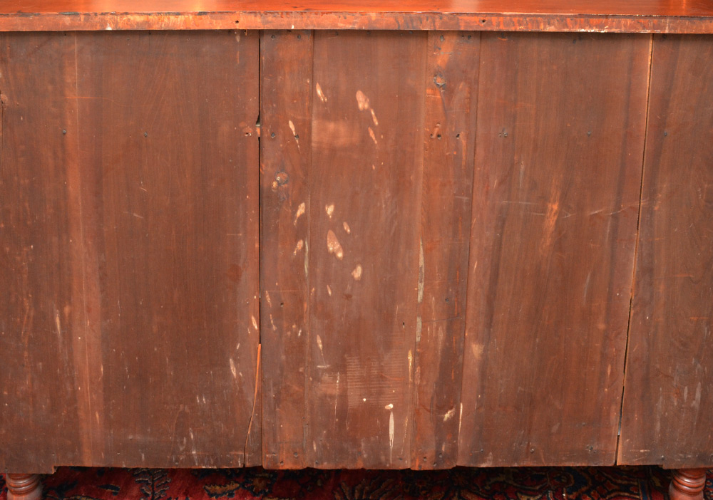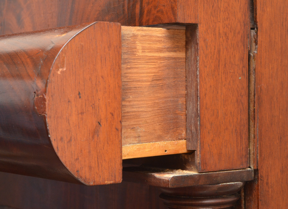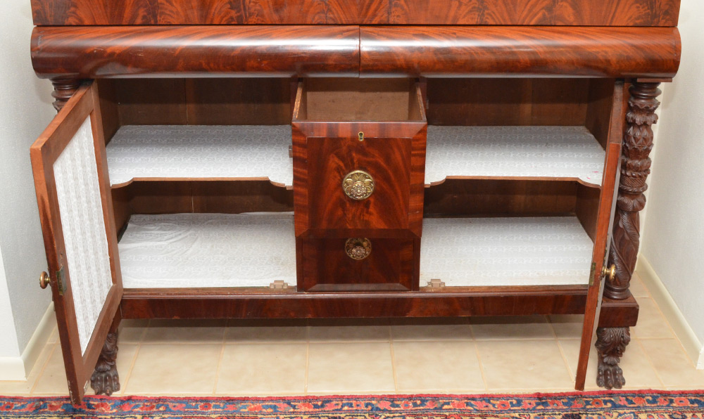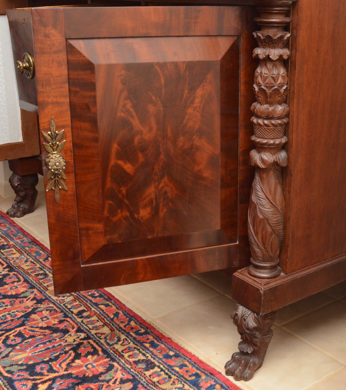 EARLY 19TH CENTURY TRANSITIONAL SIDEBOARD: Federal / Empire transitional period richly grained mahogany, 2 swell front drawers over 2 canted panel center drawers and 2 canted panel doors. Carved and turned full column stiles, carved paw front feet.