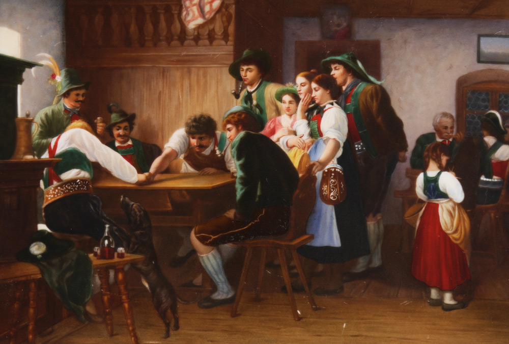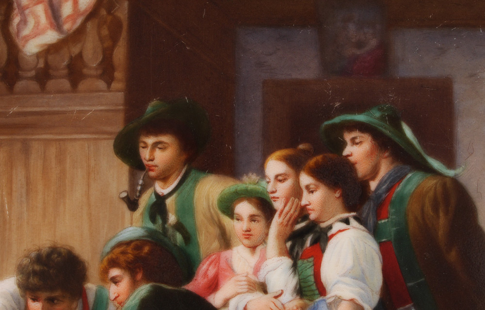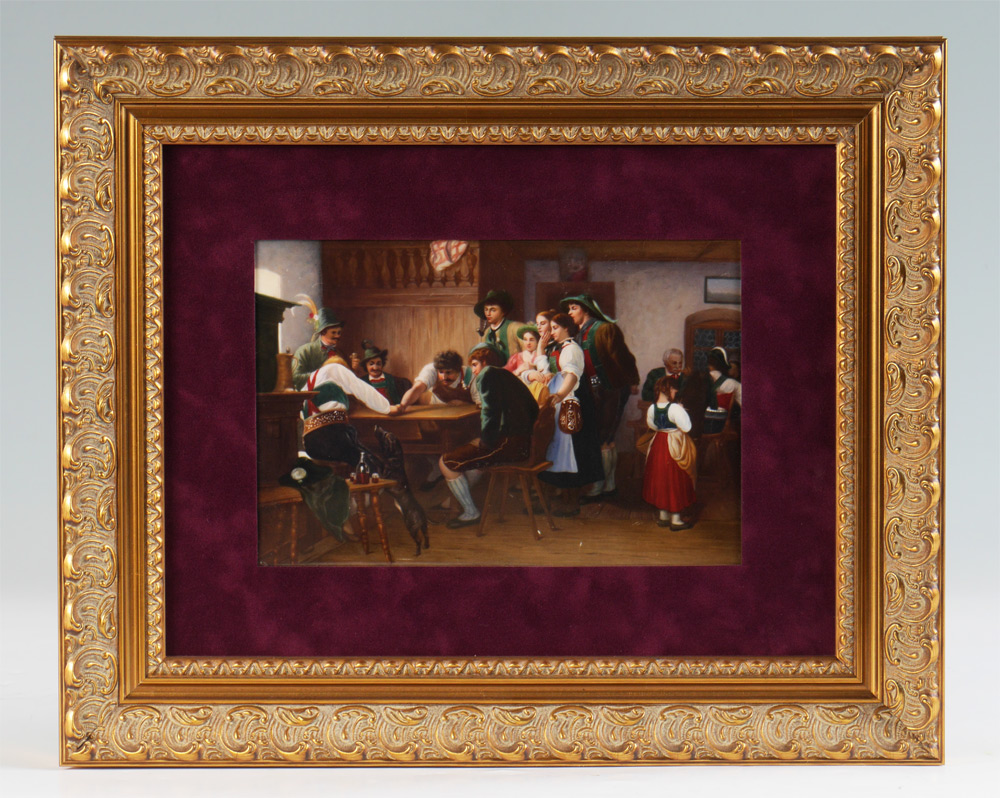 PAINTED PORCELAIN PLAQUE: German Tavern Genre Scene with Men 6 3/8'' x 9 3/8'', stamped KPM verso, framed, 13.5'' x 17''.