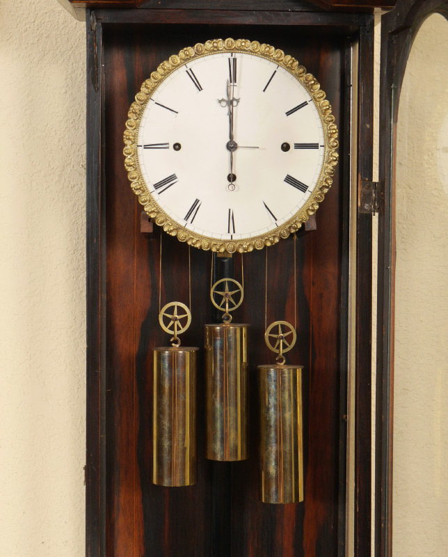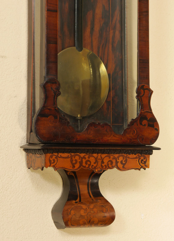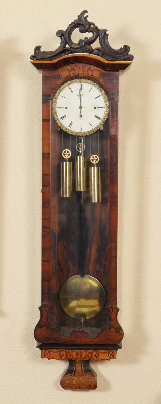 FRENCH INLAID TRIPLE WEIGHT REGULATOR WALL CLOCK: Rococo style carved removable pediment, rosewood veneer case with foliate scroll marquetry. Porcelain dial with Roman numerals, unmarked triple weight time and strike movement. Overall 48 3/4'' h. x 12 1/4'' 5 1/4''.