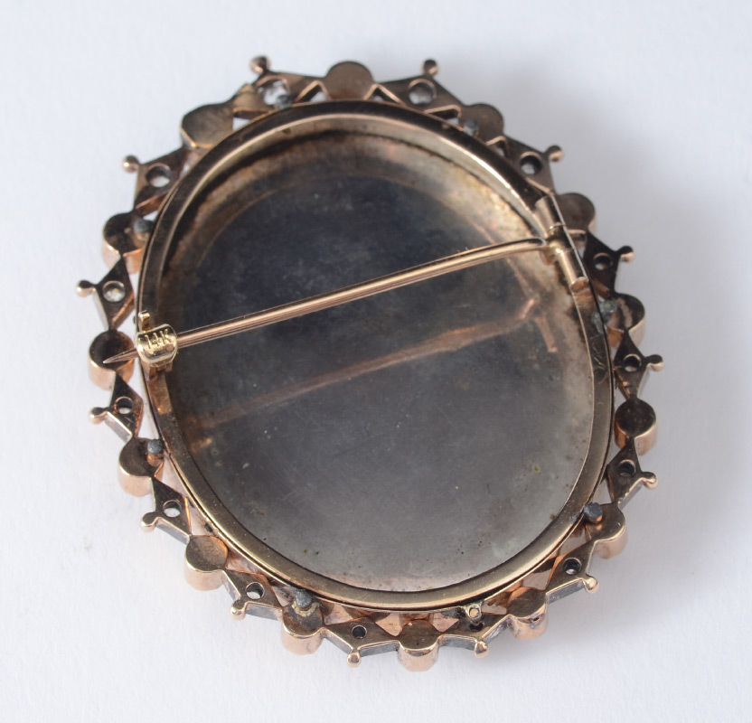 ANTIQUE MINIATURE PAINTING BROOCH: Diamonds and seed pearls set in 14K yellow gold with sterling silver frames the miniature portrait painting of Persian figure. The 14 old mine cut diamonds are bead set and weigh approx. .45 Ct. The 14 seed pearls, 3.00-3.50 mm, are collet set. Bar pin closure. Gold weight: 14.9 grams approx.