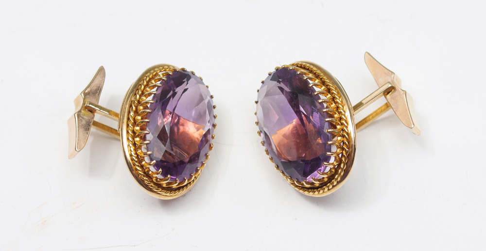 14K GOLD AND AMETHYST CUFFLINKS: 14K yellow gold cufflinks contain two oval mixed cut amethysts totaling approx. 28.00 Ct., Rated VVS in clarity (Type I), P in Hue, 3 in Tone and 2-3 in Saturation. The amethyst are prong set. Gold weight: 19.0 grams approx.