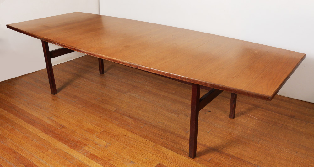 JENS RISOM MID CENTURY CONFERENCE TABLE: Slightly tapered veneer top, square legs with full length stretcher, Jen Risom Design Inc. labels under top. Overall measures 29 1/2'' h. x 108 1/2'' x 42 1/2''.