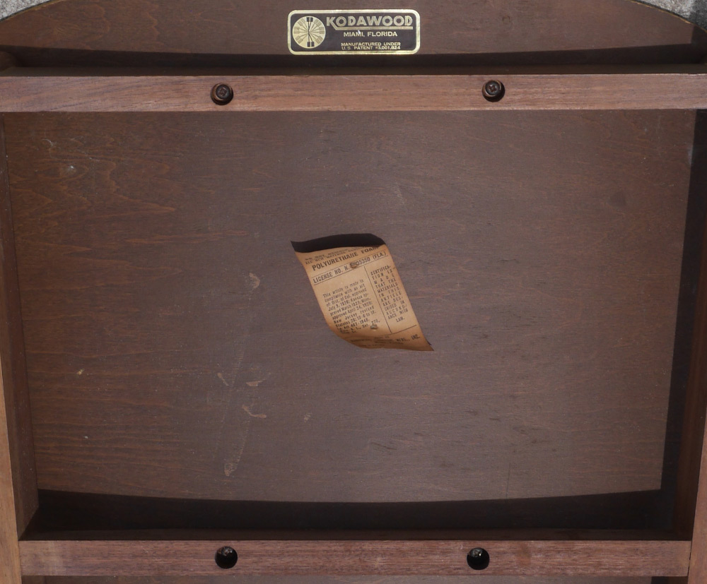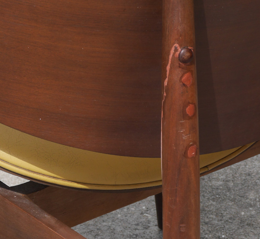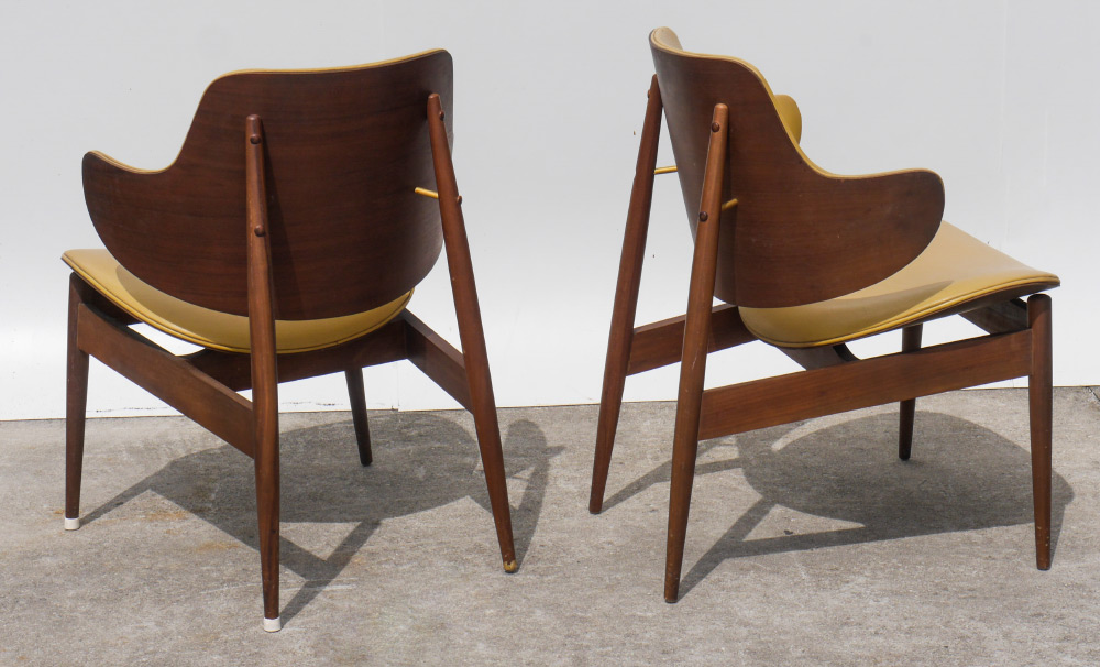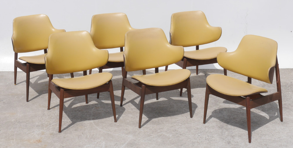6 KODAWOOD CLAM SHELL MID CENTURY ARM CHAIRS: Yellow leather upholstered shaped wood back and seats, turned legs and stretchers, Kodawood Miami labels under seats. Each measures 29 3/4'' x 22 1/2'' x 24''.