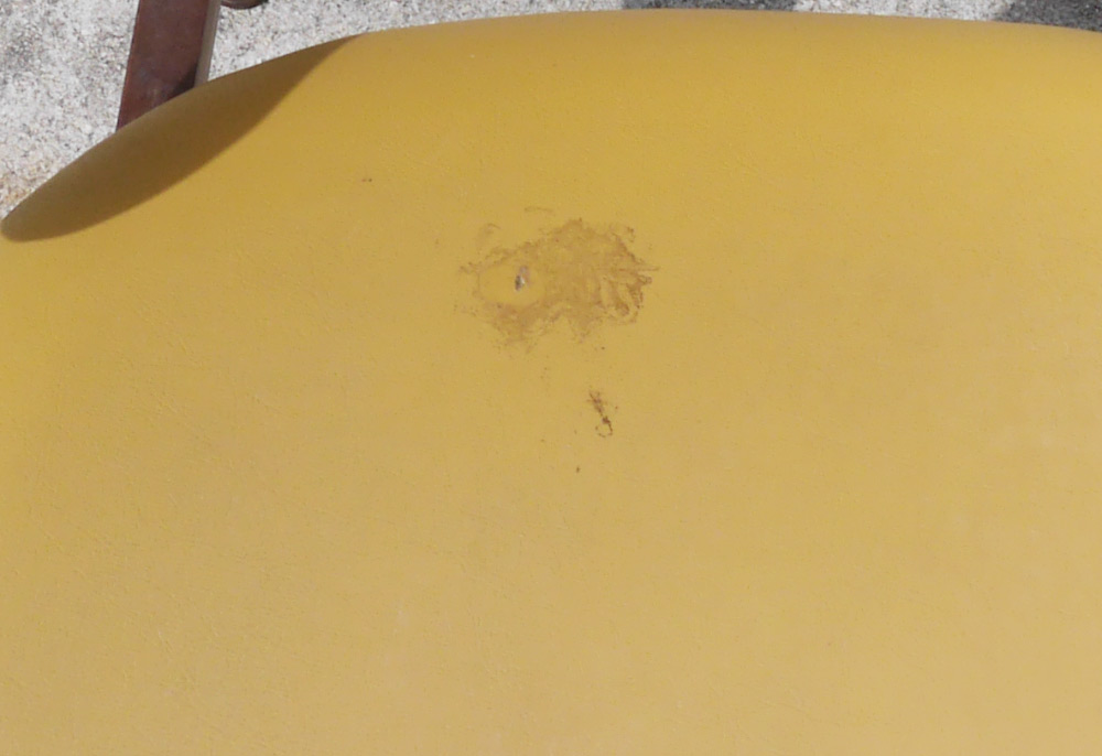 CONDITION: One chair with crude repair to back leg. All others with scratches, stains, in need of cosmetic restoration, sold as-is.