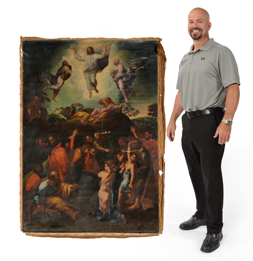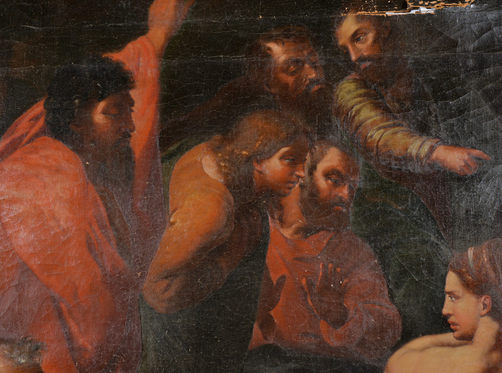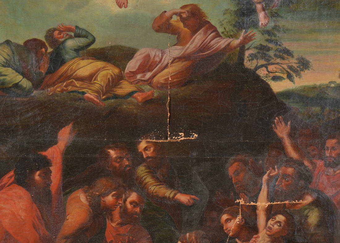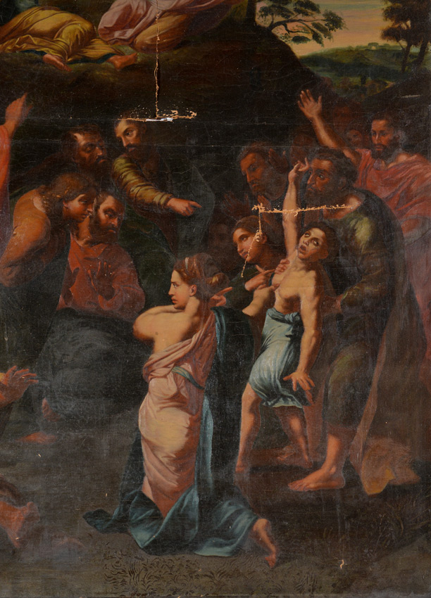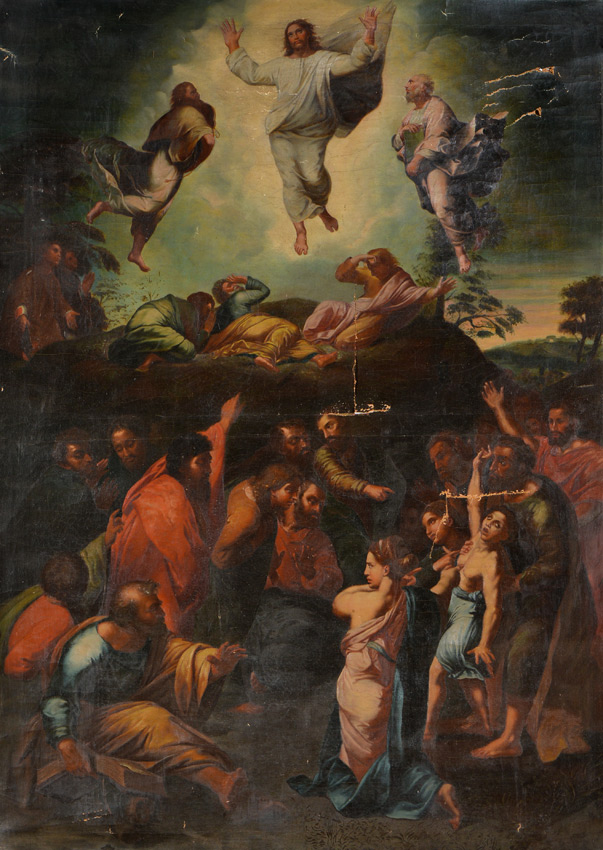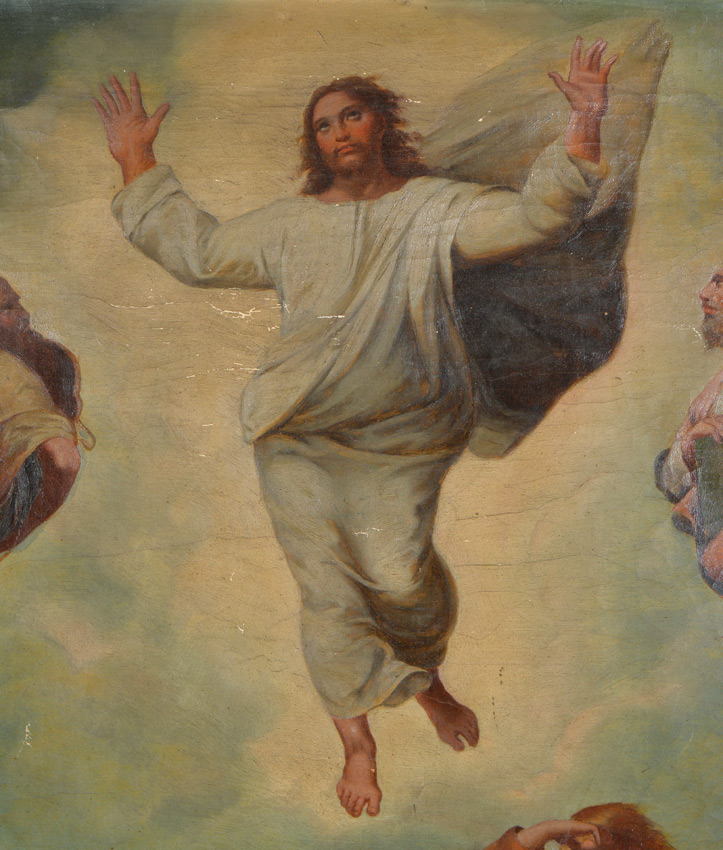 LARGE 19TH CENTURY RELIGIOUS PAINTING ASCENSION OF CHRIST: Unstretched Oil/Canvas, 54'' x 39'' painted surface, very good depiction of the original executed by a student of a master.