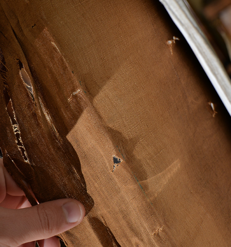 CONDITION: Needs to be re-stretched, scattered abrasions, several holes, needs cleaning, sold as is.