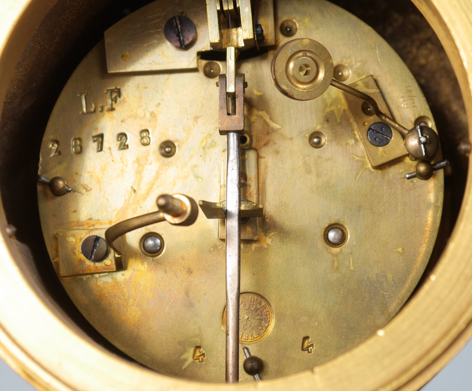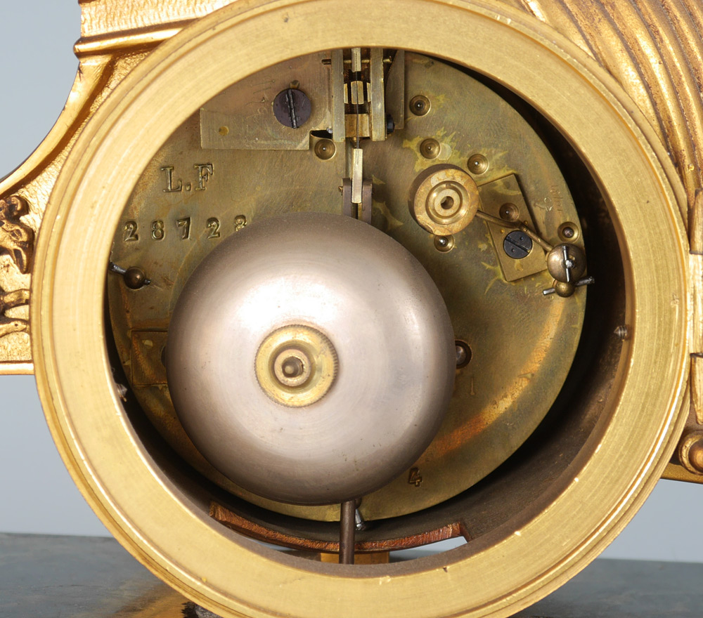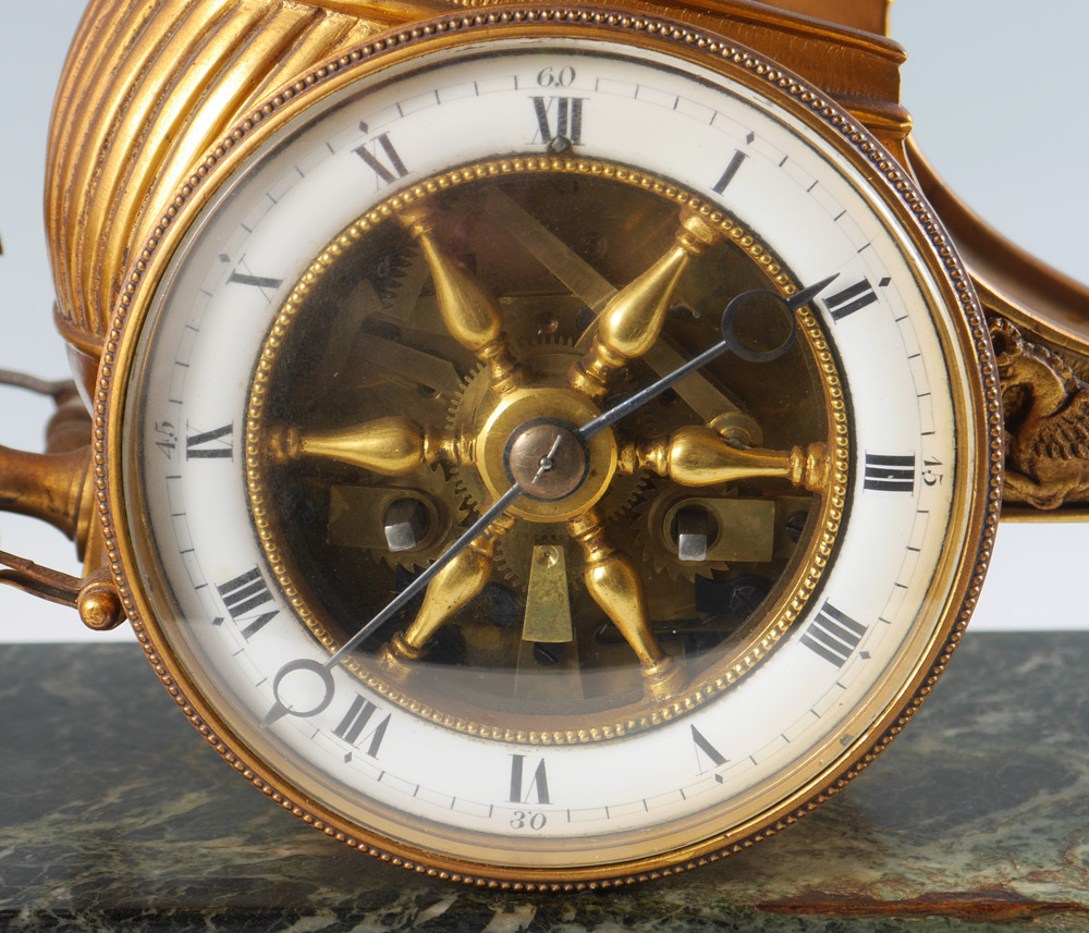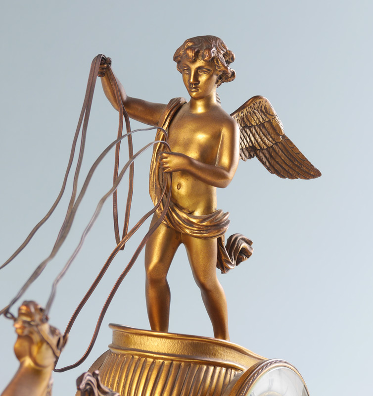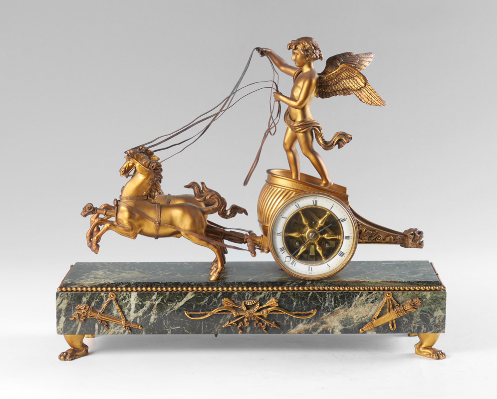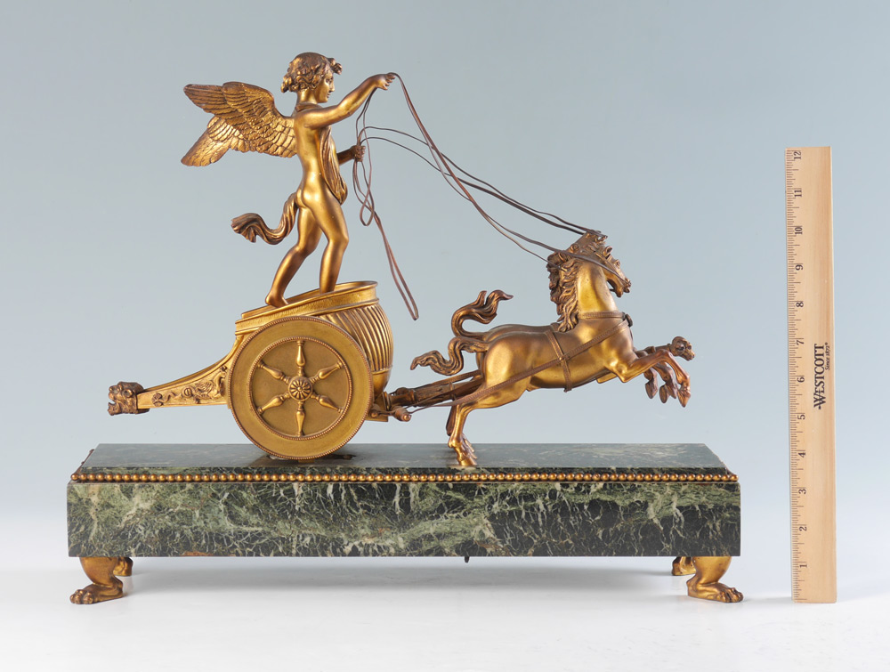 FRENCH FIGURAL WINGED CHERUB CHARIOT CLOCK: Patinated bronze figure of a cherub standing on a chariot with 2 horses, front bezel unscrews, porcelain chapter ring with Roman numerals, spoked center to dial. Time and strike movement marked with Vincenti medallion. Marble base with applied beaded trim and decoration, all on 4 paw feet. Overall measures 14 3/4'' h. x 18'' x 5 1/4''.