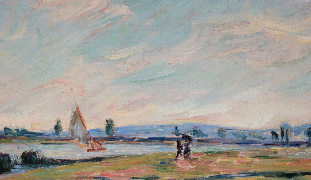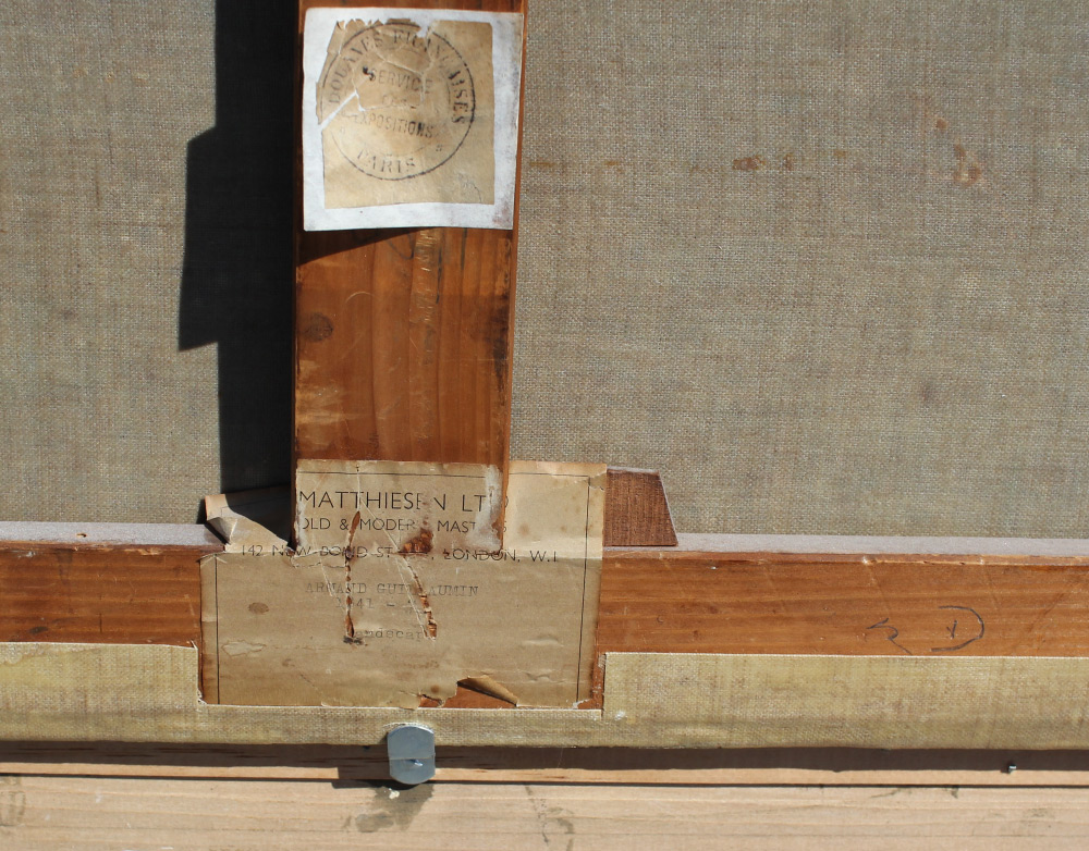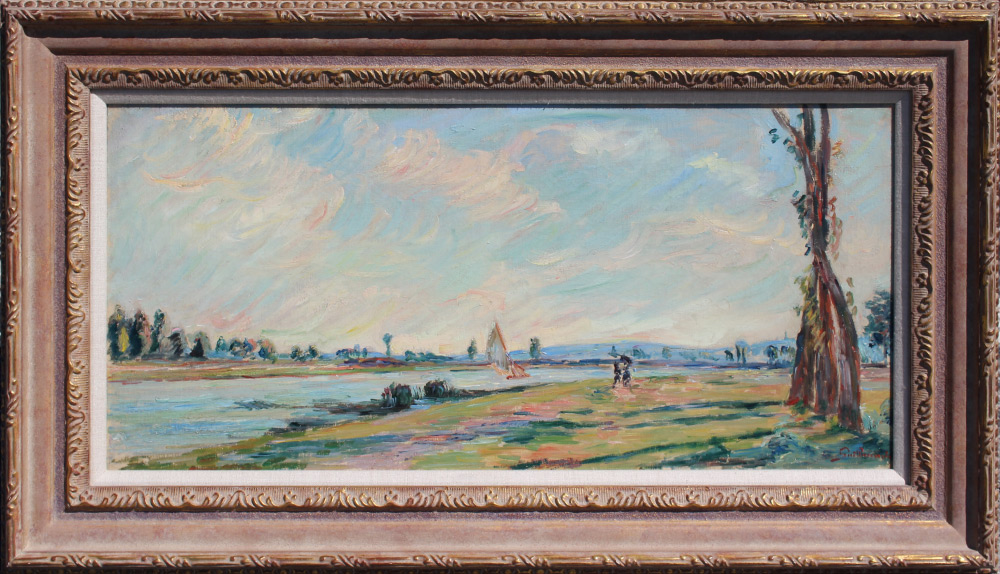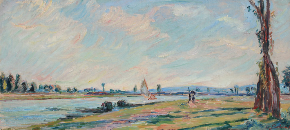 GUILLAUMIN, Jean Baptiste Armond, (French, 1841-1927): ''Bords de Riviera'', Oil/Canvas, 13.5'' x 28.5'', signed lower right, contemporary custom frame, 20.25'' x 35.5''. Several earlier labels affixed verso. Guillaumin was a founding member of the group we now recognize to be the Impressionists including Monet, Pissarro, Renoir, Sisley, Degas, Cezanne and Morisot. He became lifelong friends with Cezanne and Pissarro. He is remembered for his landscapes of Paris and his pieces can be found in major museums around the world.