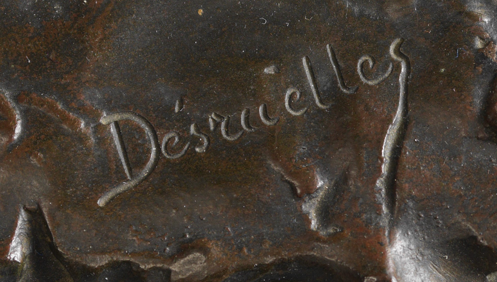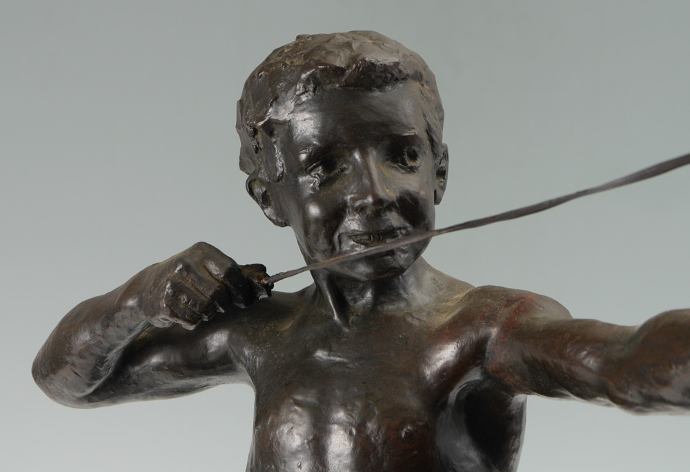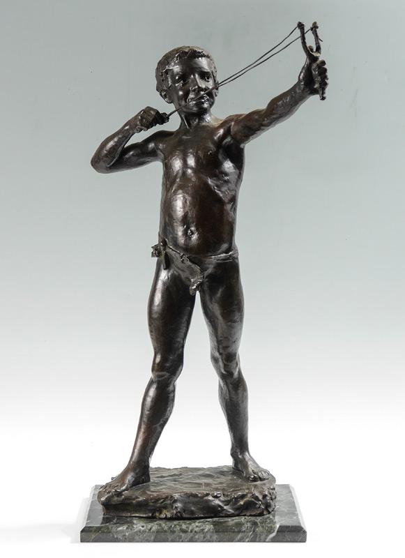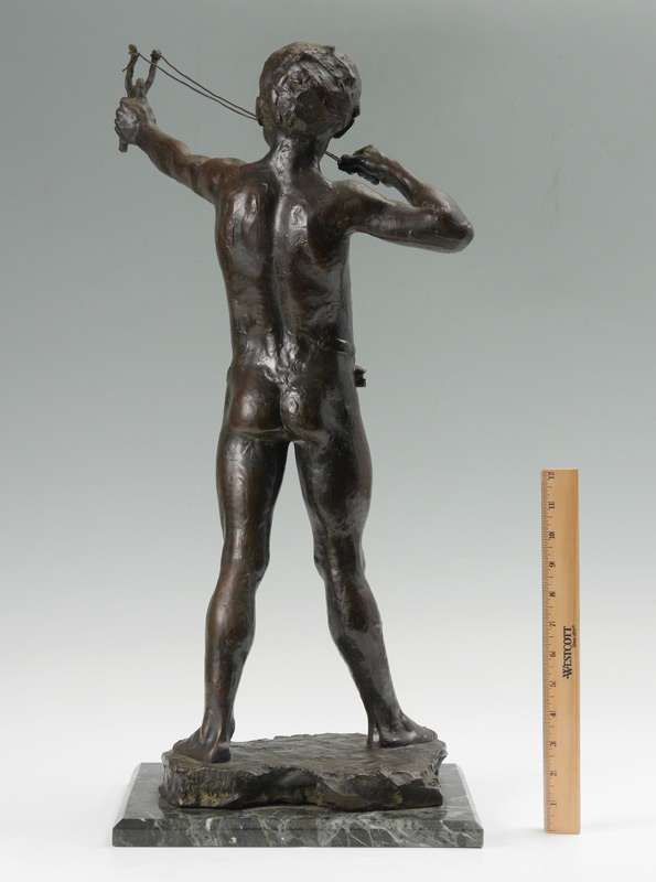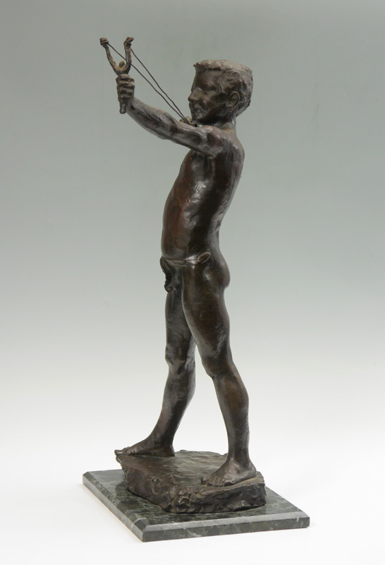 DESRUELLES, Felix, (French, 1865-1943): David with Slingshot Taking Aim, Bronze, 26'' at tallest point, 12'' w, 10'' d, signed on base, Jabouef Bezout Fondeurs mark.