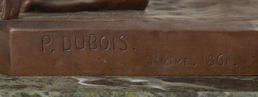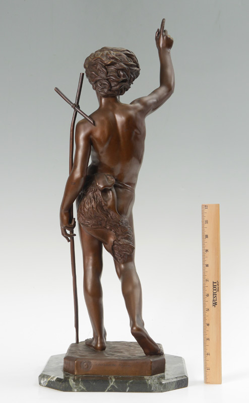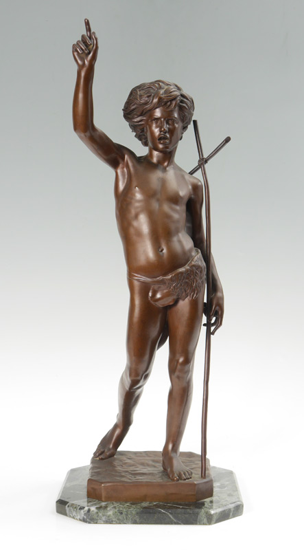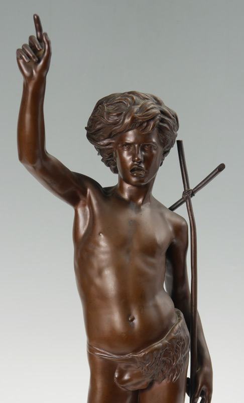 DUBOIS, Paul, (French, 1829-1905): John the Baptist, Bronze, 25'' ht, signed on base F. Barbedienne foundry mark, affixed to beveled marble plinth. Overall 26'' x 10.75'' x 10.75''. Although Dubois' family wanted Paul to become a lawyer, he chose to study at the atelier of Armand Toussaint at the cole Nationale des Beaux-Arts to become an artist. He was awarded several honors and positions of honor and was decorated with the Grand Croix (Grand Cross) of the Lgion d'honneur.
