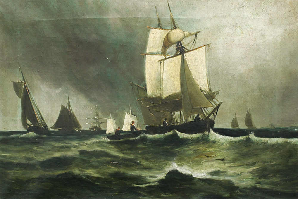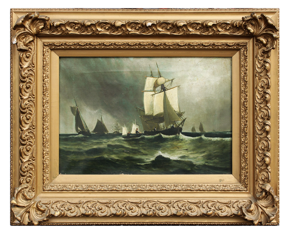 ENGLISH CHANNEL MARITIME PAINTING ILLEGIBLY SIGNED: Oil/Canvas, 12'' x 18'', circa 1900, signed lower left J. Capelli?, gilded gesso frame of the period, 20.5'' x 27''.