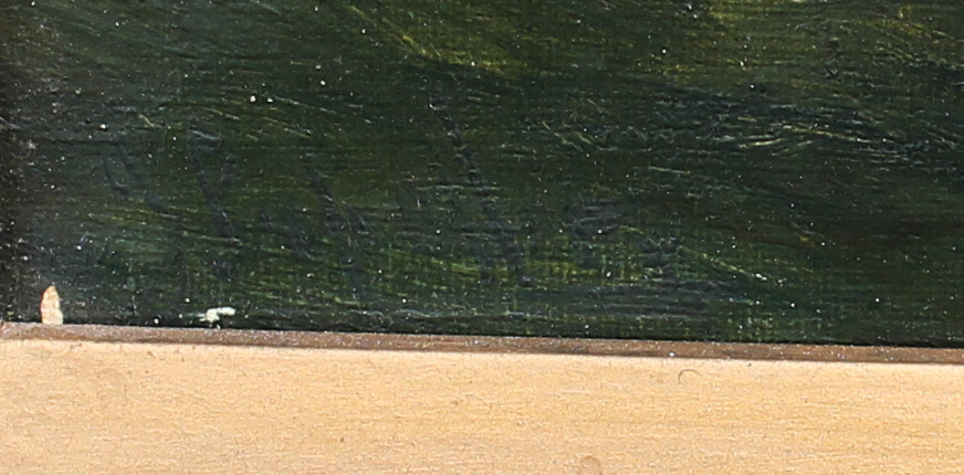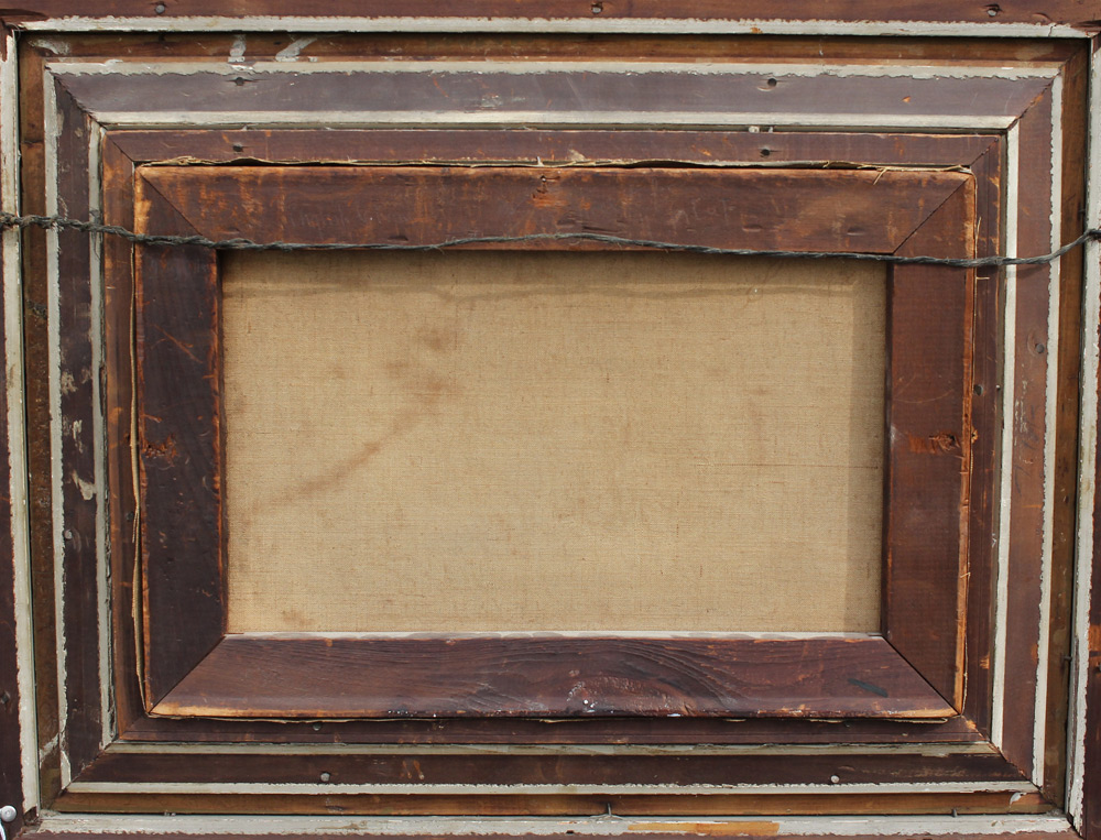 CONDITION: Needs cleaning, stretcher bar wear, several flecks of loss, frame has been overpainted with gold, sold as is.