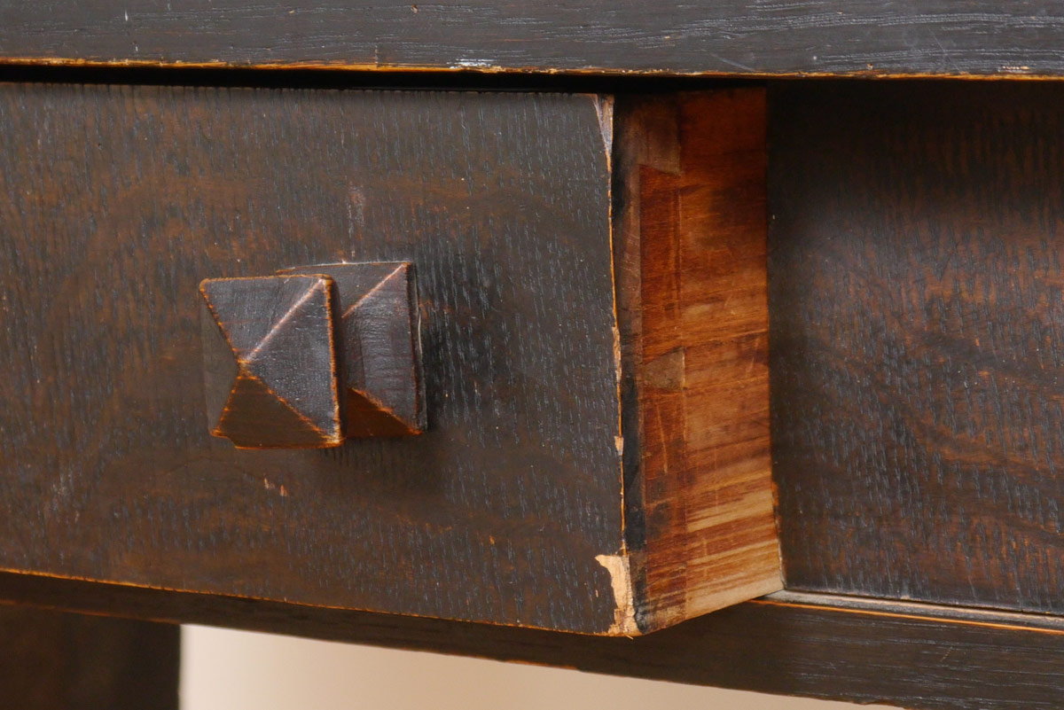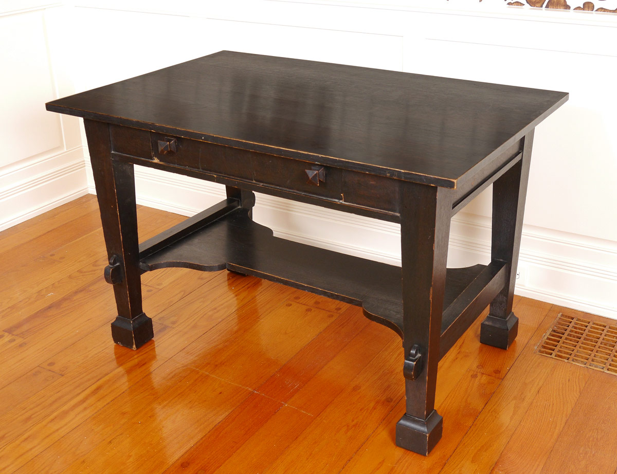 JOSEPH MCHUGH ARTS & CRAFTS OAK LIBRARY TABLE: Attrib. Joseph McHugh, 4 board top over single drawer. Shaped lower shelf. 29 1/4'' h. x 59'' x 29 1/4''.
