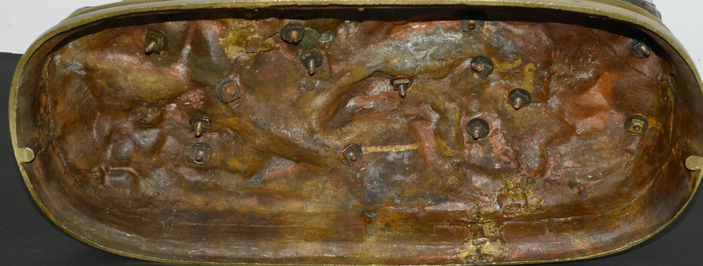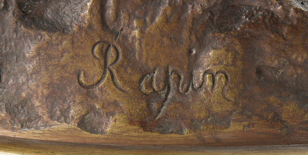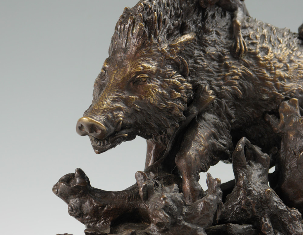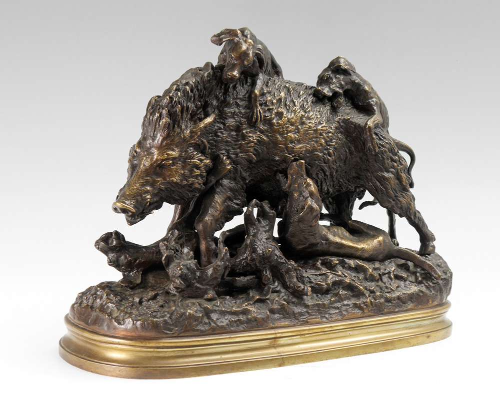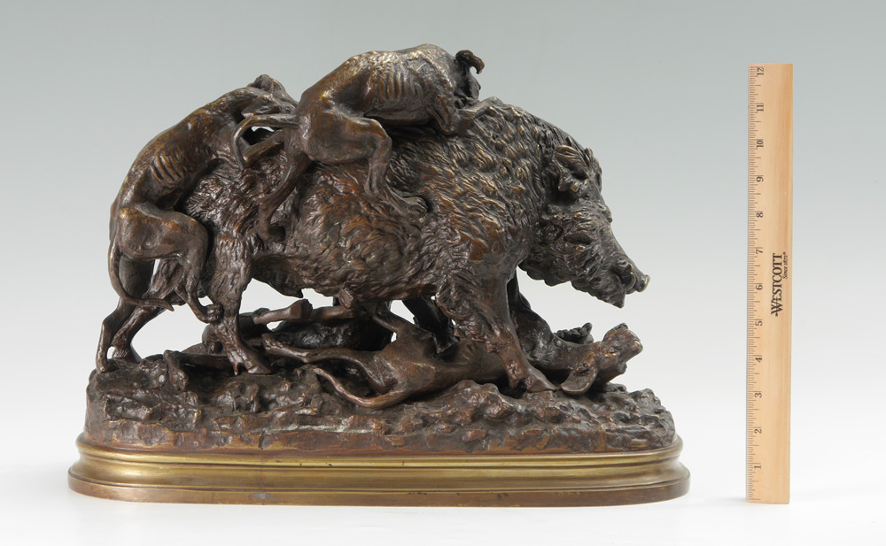 DRAMATIC BRONZE BOAR HUNT SCULPTURE: Depicts a Large Boar Being Attacked by Several Dogs, 12'' ht, 17'' w and 7'' d. Illegibly signed Rapin?.