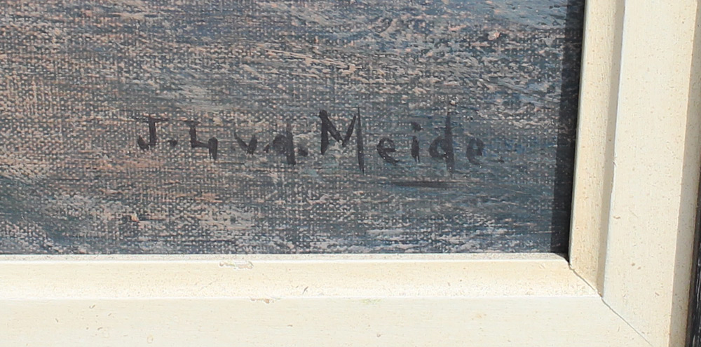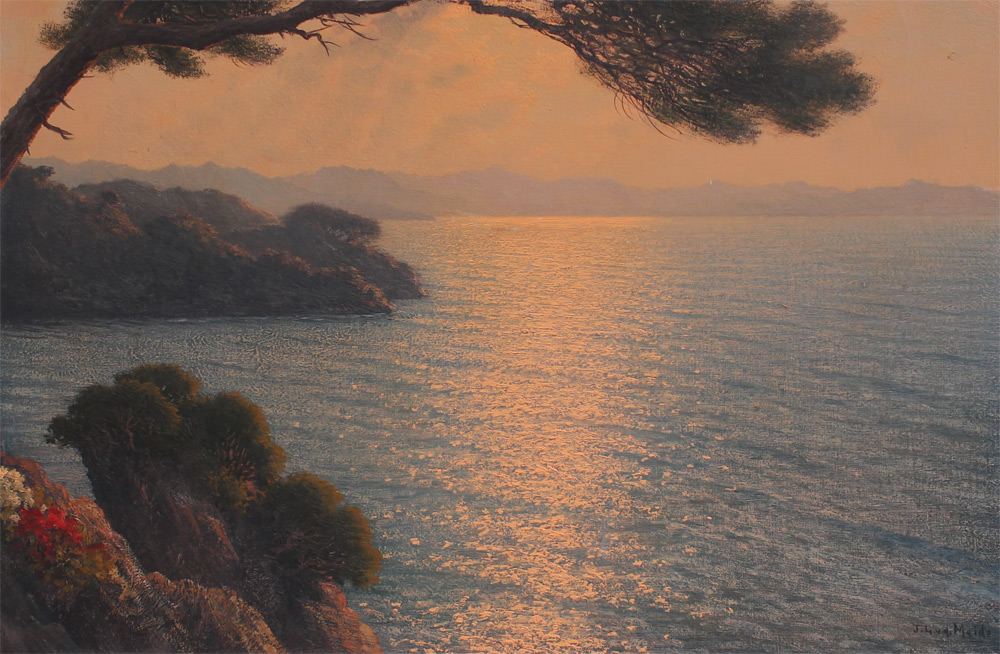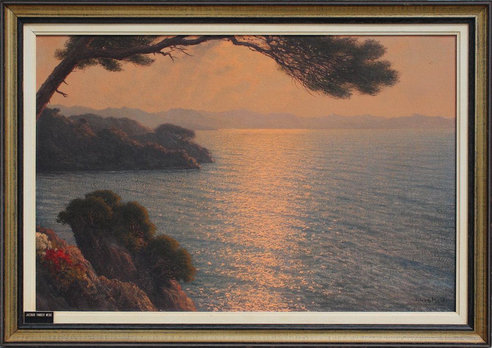 VAN DER MEIDE, Jacobus, (Dutch, 1910-87): Glistening Sunset on Coastal Water, Oil/Canvas, 24'' x 36'', signed lower right, original frame , 29.5'' x 41.5''.