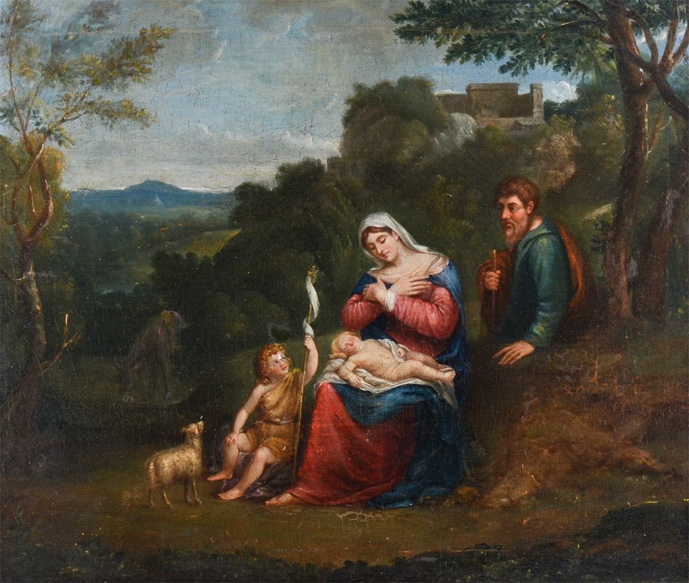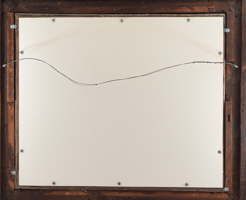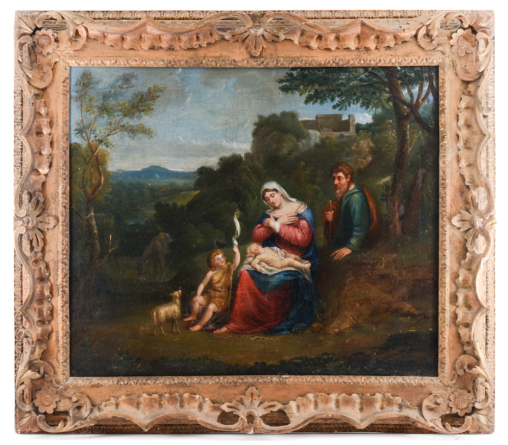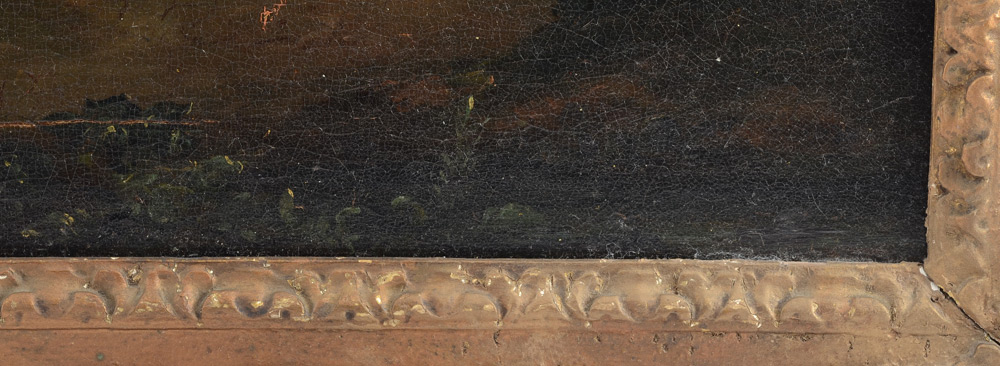 CONDITION: Older reline, scattered craquelure and inpaint throughout, scattered flecking. Frame has repair and some missing pieces, sold as is.