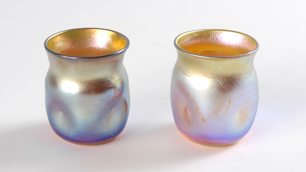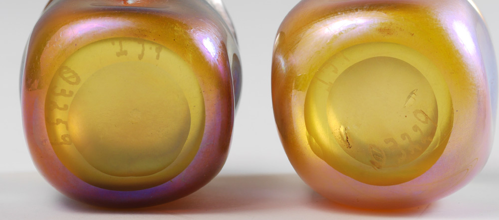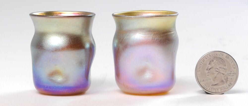 2 TIFFANY FAVRILE ART GLASS TOOTHPICKS: Gold iridescent with blue overtones. Dimpled sides. Each signed LCT, one is numbered 03229, the other 03259. 1 3/4'' tall.