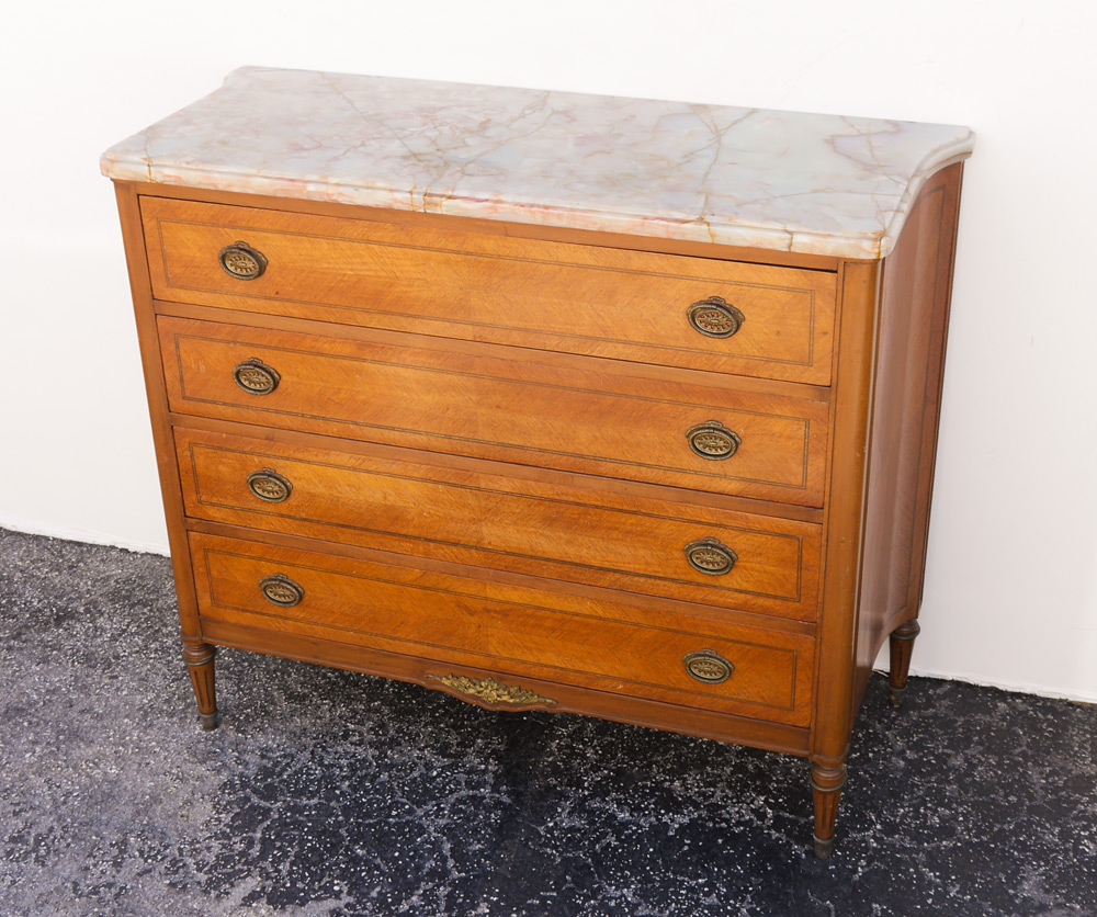 ONYX TOP 4 DRAWER COMMODE: Shaped onyx top over 4 drawer base with brass pulls and applied floral decoration at skirt, sides with slight curve, fluted legs, overall measures 36'' h. x 42 3/4'' x 17 1/2''.