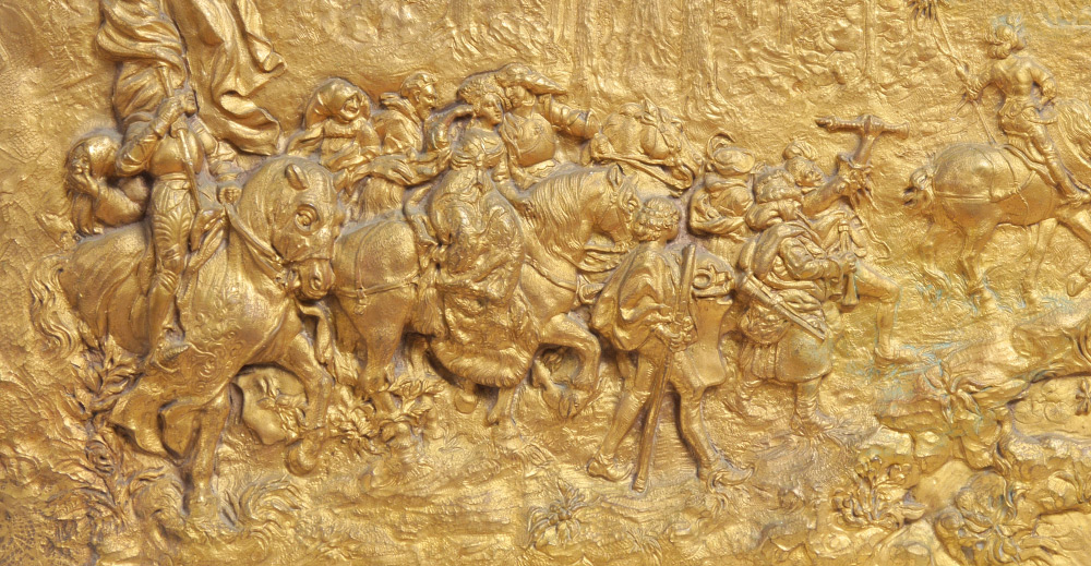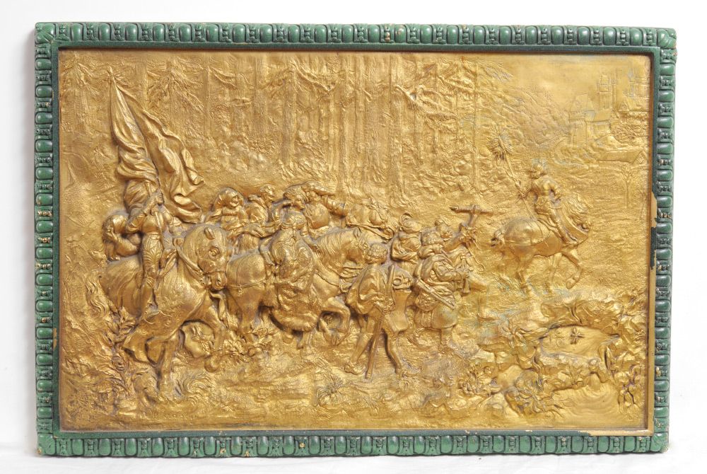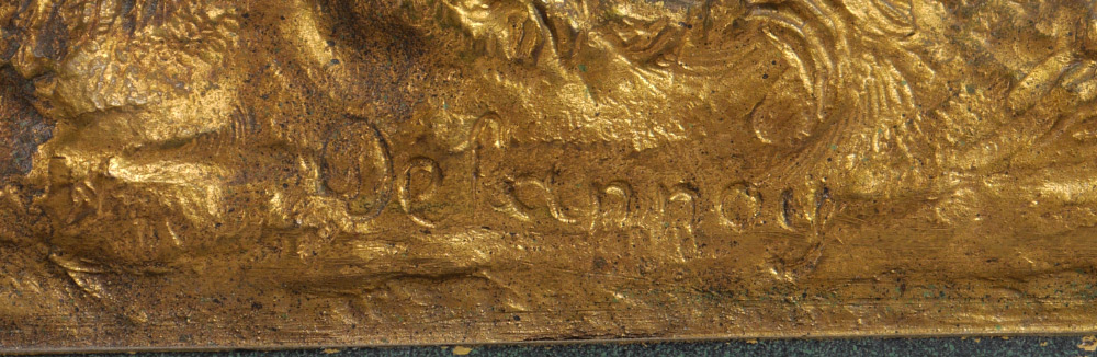 MAURICE DELANNOY GILDED BRONZE PLAQUE: Depicts a Large Procession of Soldiers and Villagers on Foot and Horseback Approaching a Kingdom. Overall measures including patinated bronze frame, 11.25'' x 16.75''. Signed in lower margin.