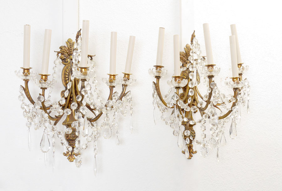 PAIR OF CRYSTAL & GILT BRONZE WALL SCONCES: French style 5 light sconces, gilt bronze with foliate motifs and crystal prism swags. Overall measures 22'' x 16 1/2'' x 10 1/2''