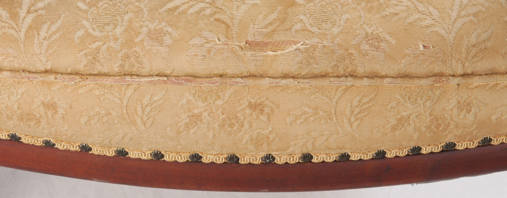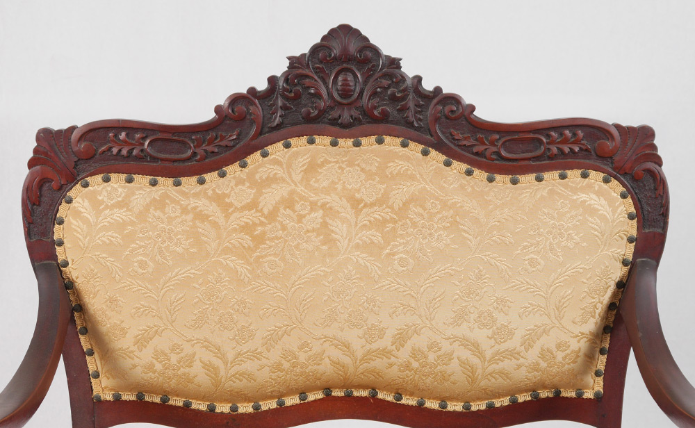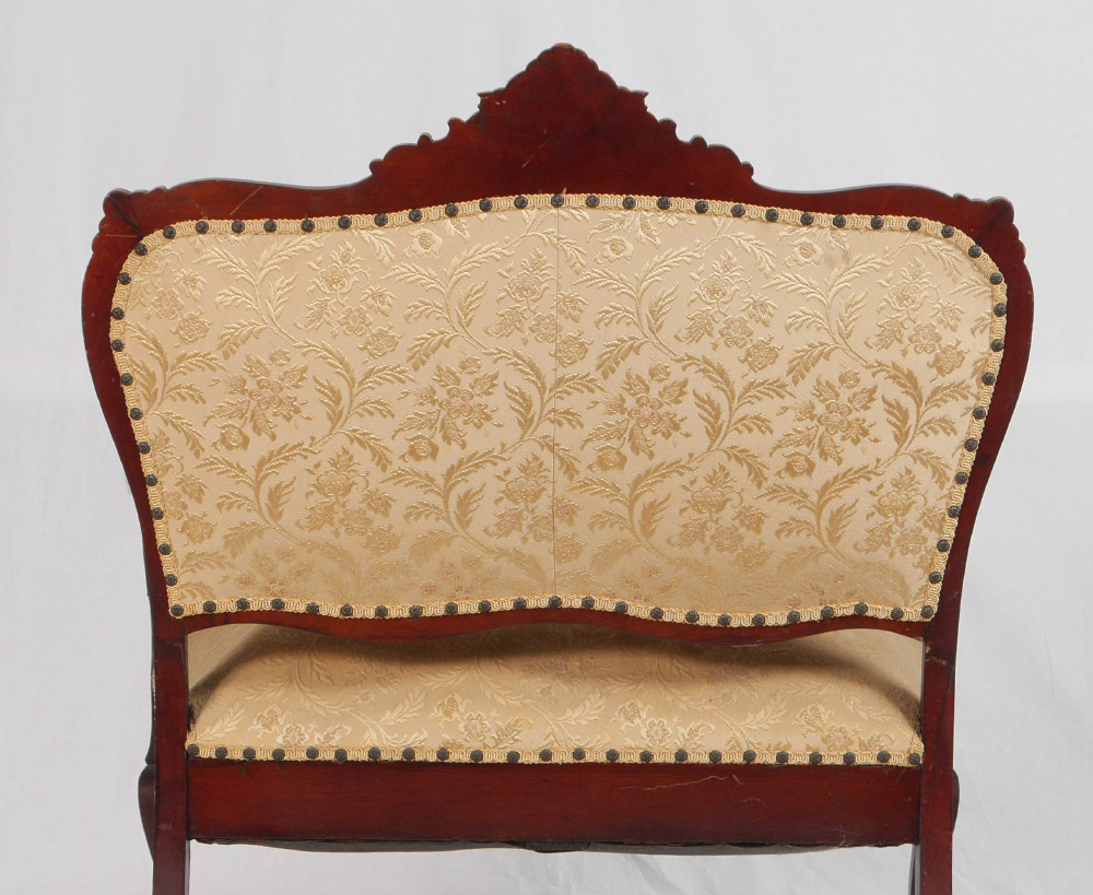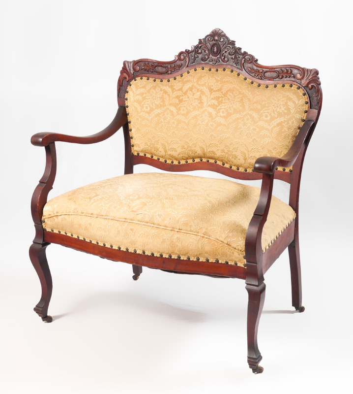 DIMINUTIVE CARVED EASTLAKE SETTEE: Carved top rail with foliate scroll motifs, shaped arms, supports, skirt and legs. Tacked floral motif upholstery. 42'' h. x 36 1/2'' x 23''.