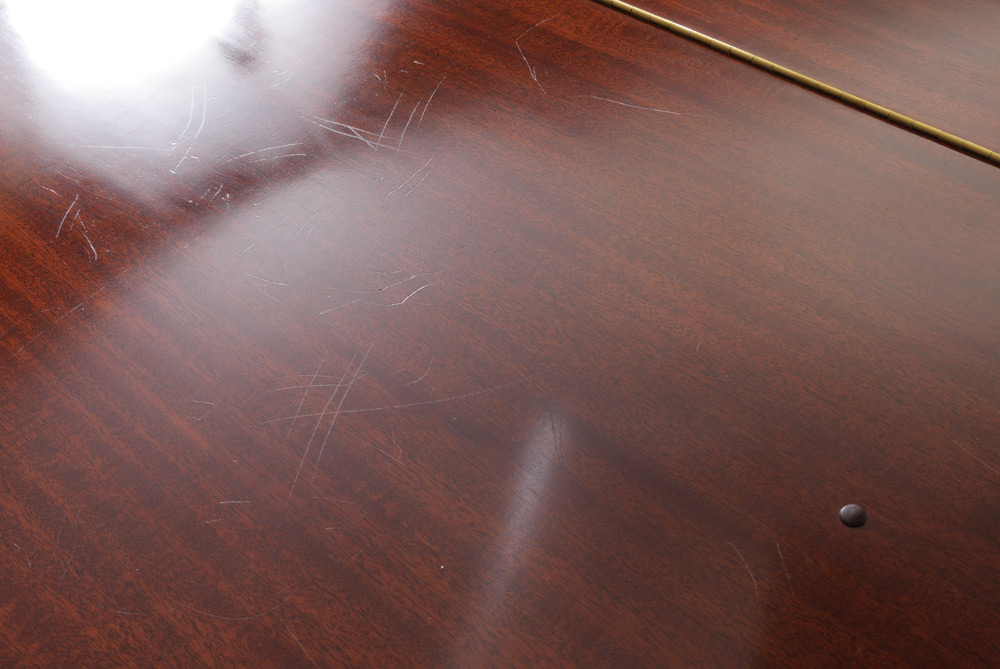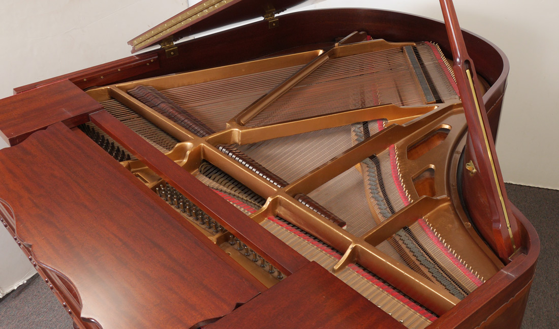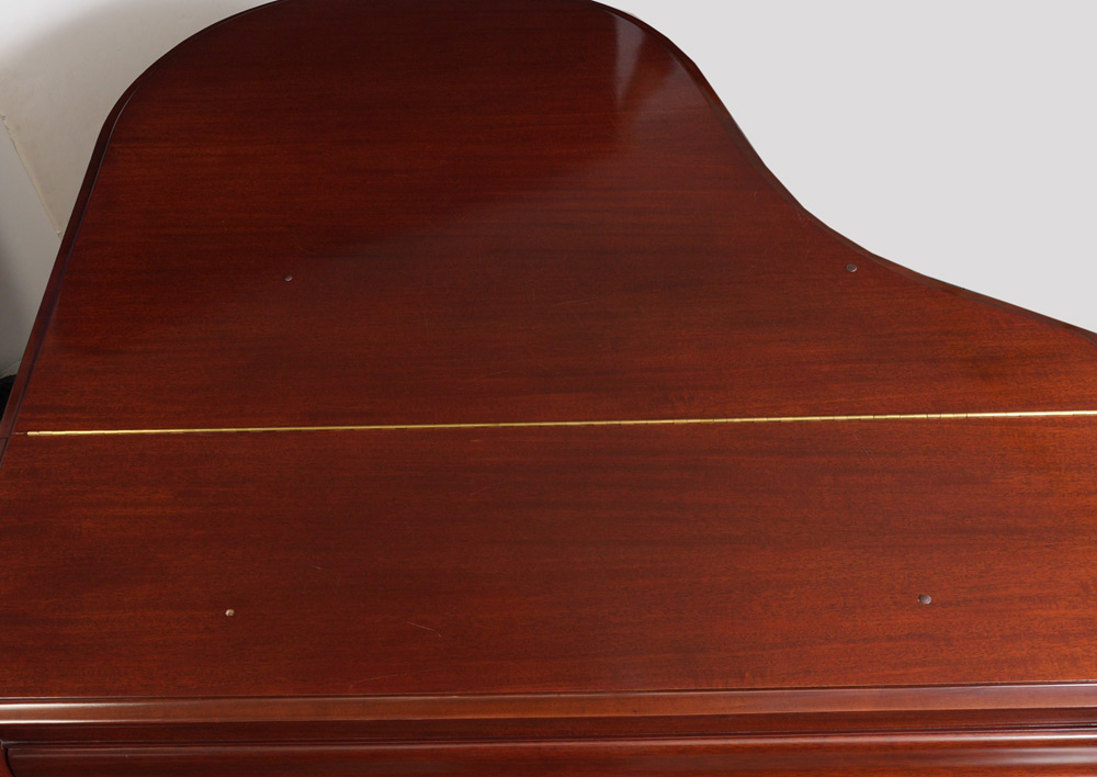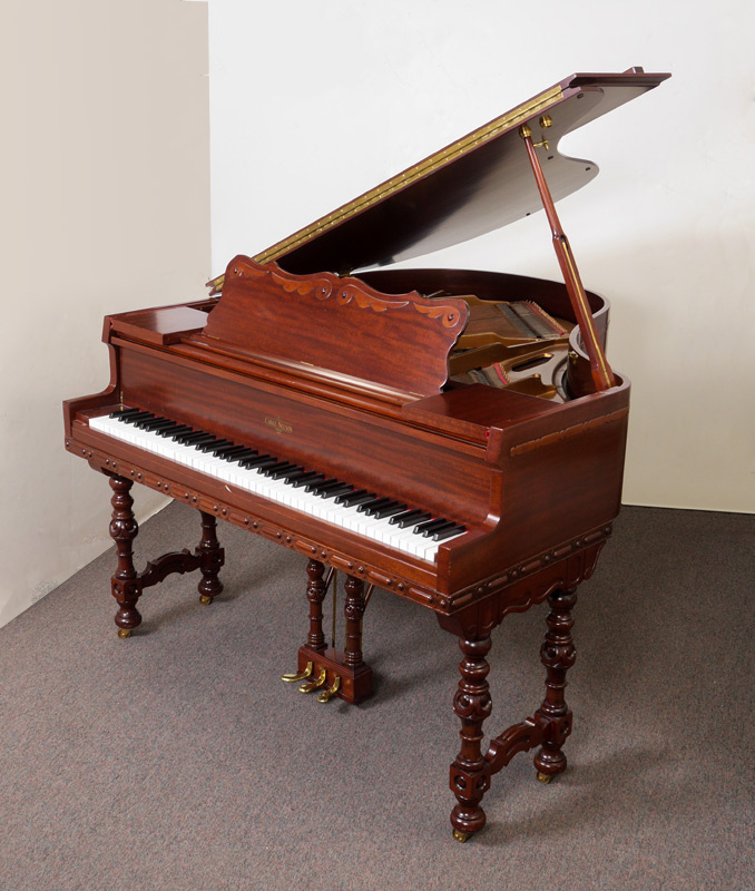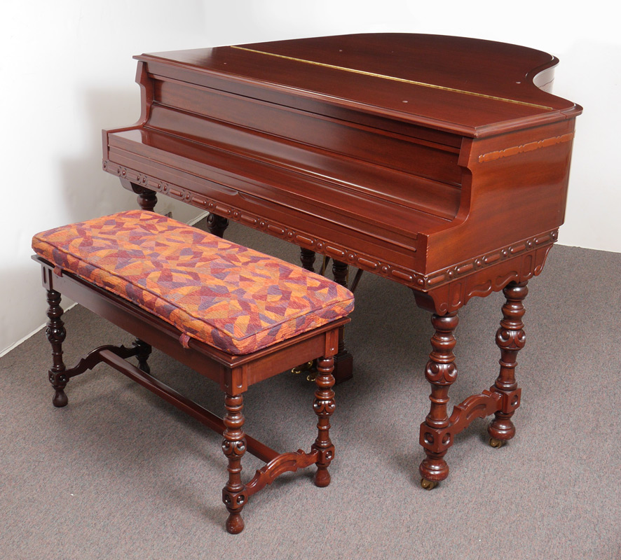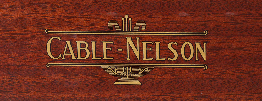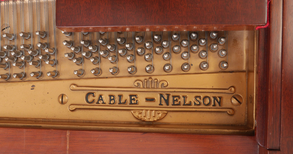 CABLE-NELSON MAHOGANY BABY GRAND PIANO: Mahogany case, with carved lower trim, carved and turned pedestal legs. Both case and sound board well marked with Cable-Nelson, soundboard with serial number 170017. 38 1/2'' h. x 58'' x 54''. Sold with matching bench with cushion.