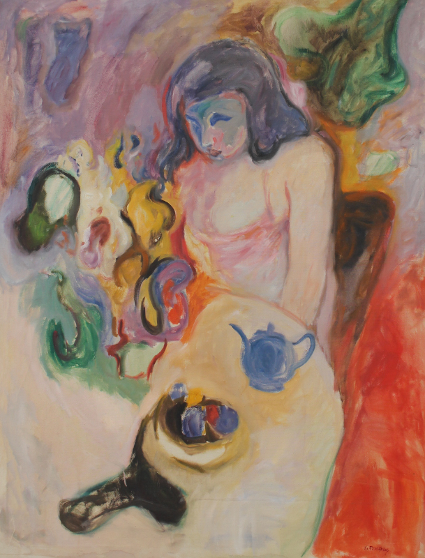 ROSOFSKY, Seymour, (American, 1924-1981): Seated Female, Oil/Canvas, 46'' x 36'', signed lower right, painted thin edge wood frame, 46.5'' x 36.5'', Christie's August 2012 sale 2576 Lot 60 affixed verso. Rosofsky received a B.F.A. and M.F.A. from the Chicago Art institute. His paintings present the cultural, social and artistic happenings of the latter half of the 20th century from his perspective. He managed to present his personal views and struggles in a way that others can relate to employing naturalism and surrealism in his work.