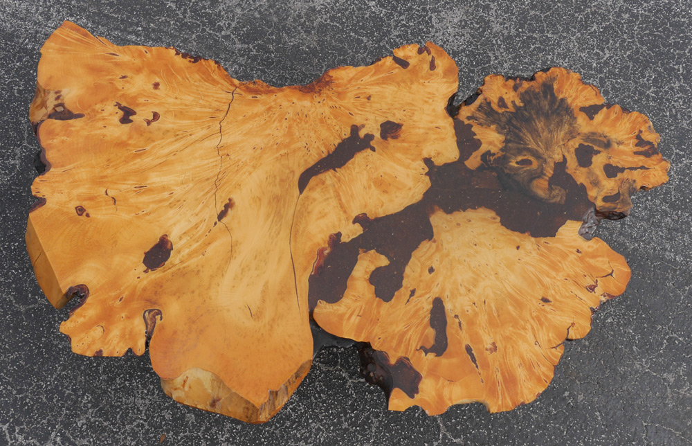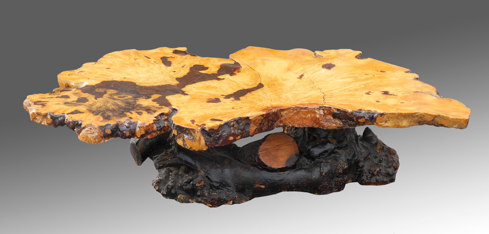 THE BURLWOOD COMPANY STAR DUST BURL COFFEE TABLE: Live edge table made from burl from the Buckeye tree and inherent minerals found in the burl from central California. Circa 1970's, labeled ''An Original Star Dust No. 59181, By The Burlwood Co. Redding, California''. Overall measures 16 1/4''ht x 65'' x 38''. Sold with an original flyer about the company.