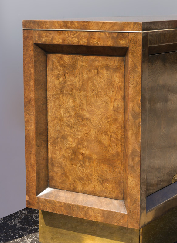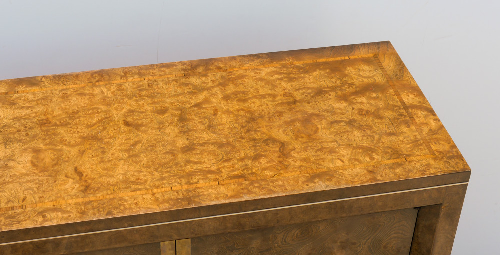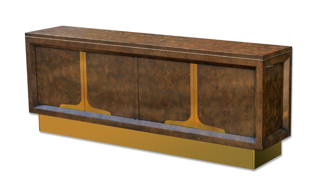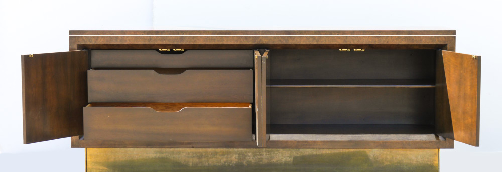 MASTERCRAFT BURL & BRASS CREDENZA: Top with banded inlay on burl veneer, brass trim. 4 doors with brass accents, left side opens to 3 drawers, right side with single shelf, brass clad base. Overall 32 1/2'' h. x 84'' x 18''.