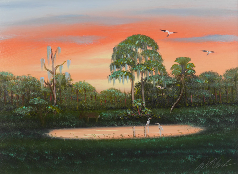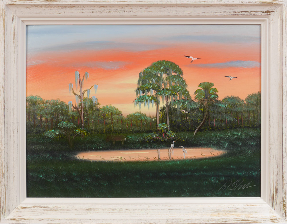 BLACK, Al, (American, 20th/21st Century): Florida Highwaymen sunset pasture scene with deer, birds, and pond, Oil/Masonite, 18'' x 24'', painted frame 22 1/2'' x 27 1/2''.