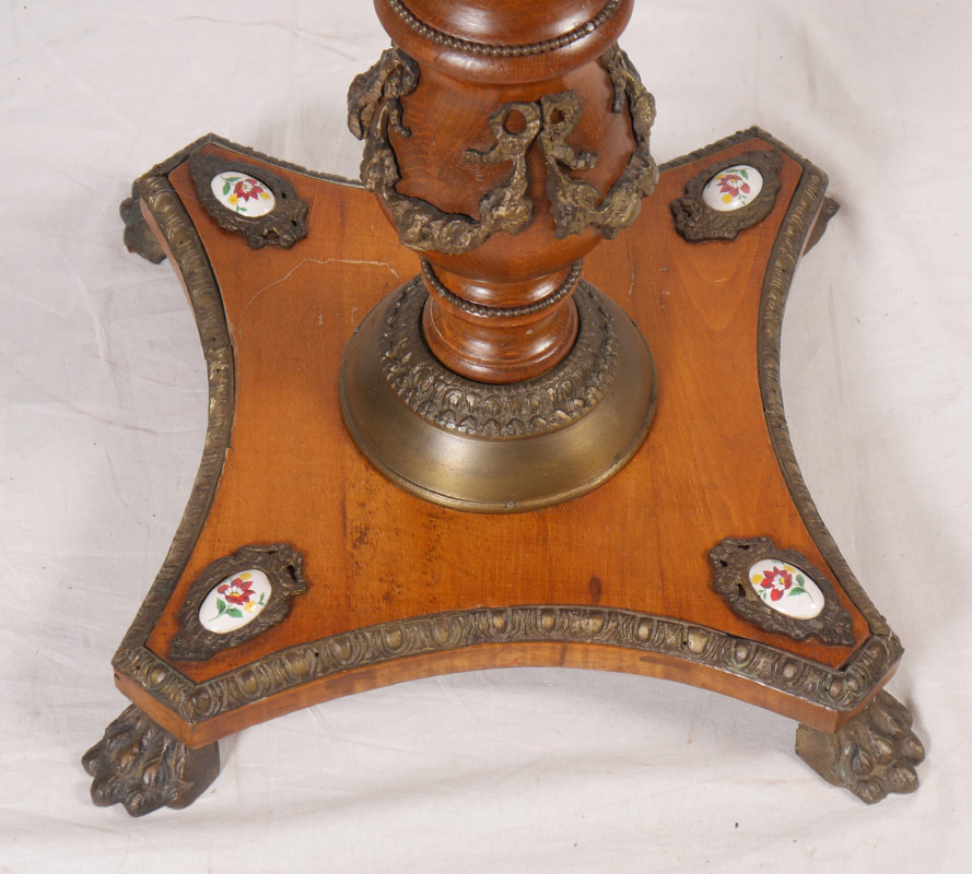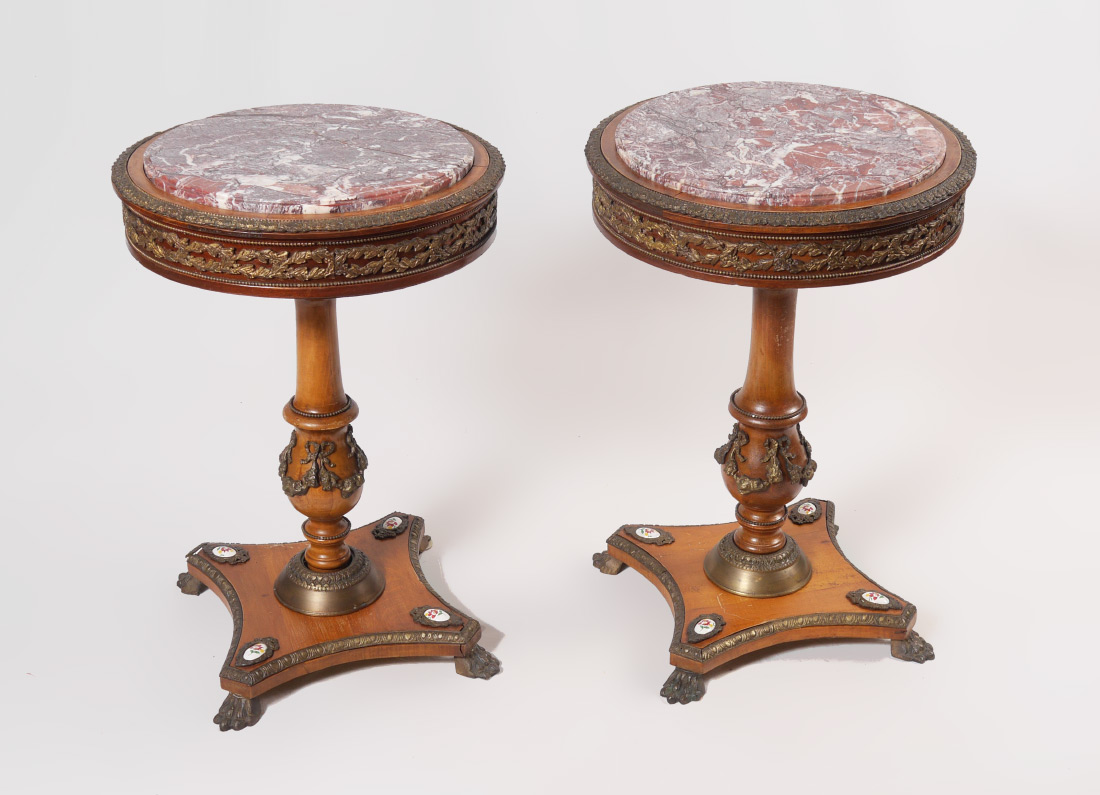 PAIR OF MARBLE TOP FRENCH STYLE SIDE TABLES: Circular marble inset tops, applied gilt metal trim and decoration on apron, support, base and paw feet. Additional porcelain medallions applied to base, overall measures 28 1/2'' h. x 20''.